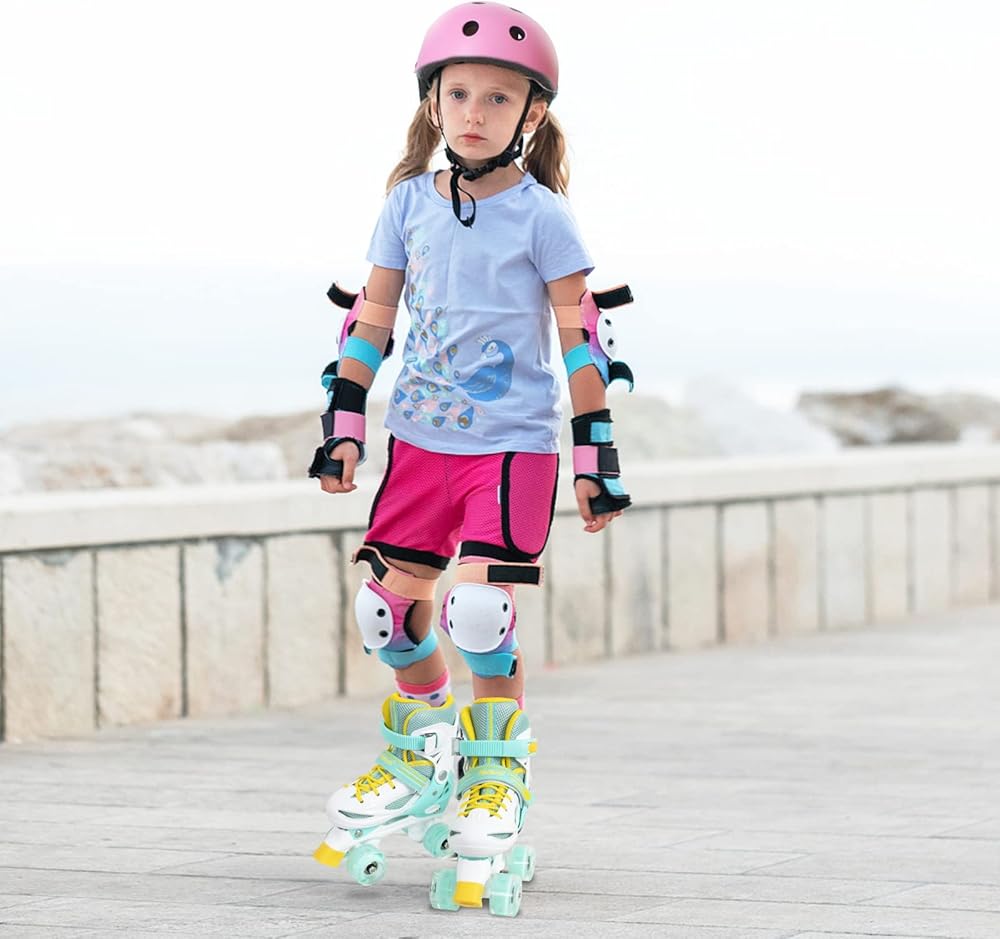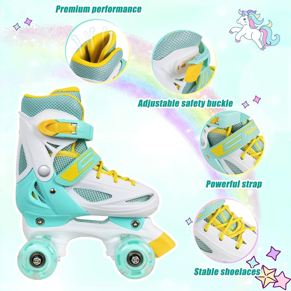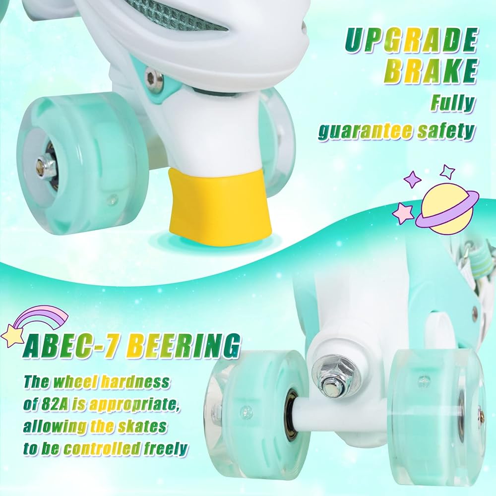 • 【8 Illuminated Wheels】Roller skates for boys and girls are equipped with 8 illuminated Wheels,all the illuminated wheels will light up and provide a colorful rainbow display when your kid start to skate. The lights are powered by wheels rolling and never need replacing batteries! (Tips: Please check and tight wheels regularly to prevent them falling off)