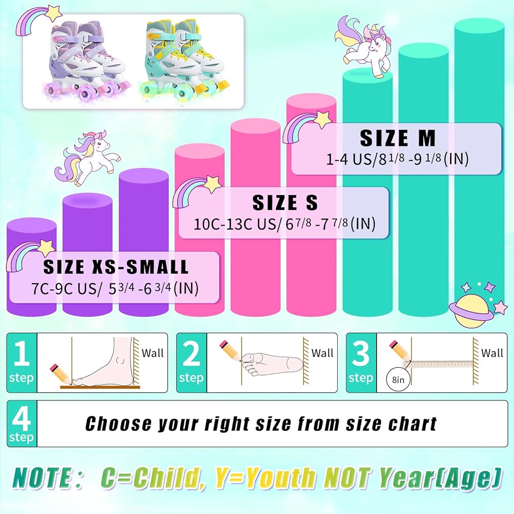 • 【Adjustable Roller Skates】Our roller skates for kids come in 3 different unisex sizes are perfect for growing feet: X-Small for toddlers(7C-9C)/ Small for little kid(10C-13C)/ Medium for big kids(1Y-4Y), With the ease of size adjustment at the touch of a button, it's easy for kids to put on/take off. (Please make sure to choose the correct size by checking the size chart)