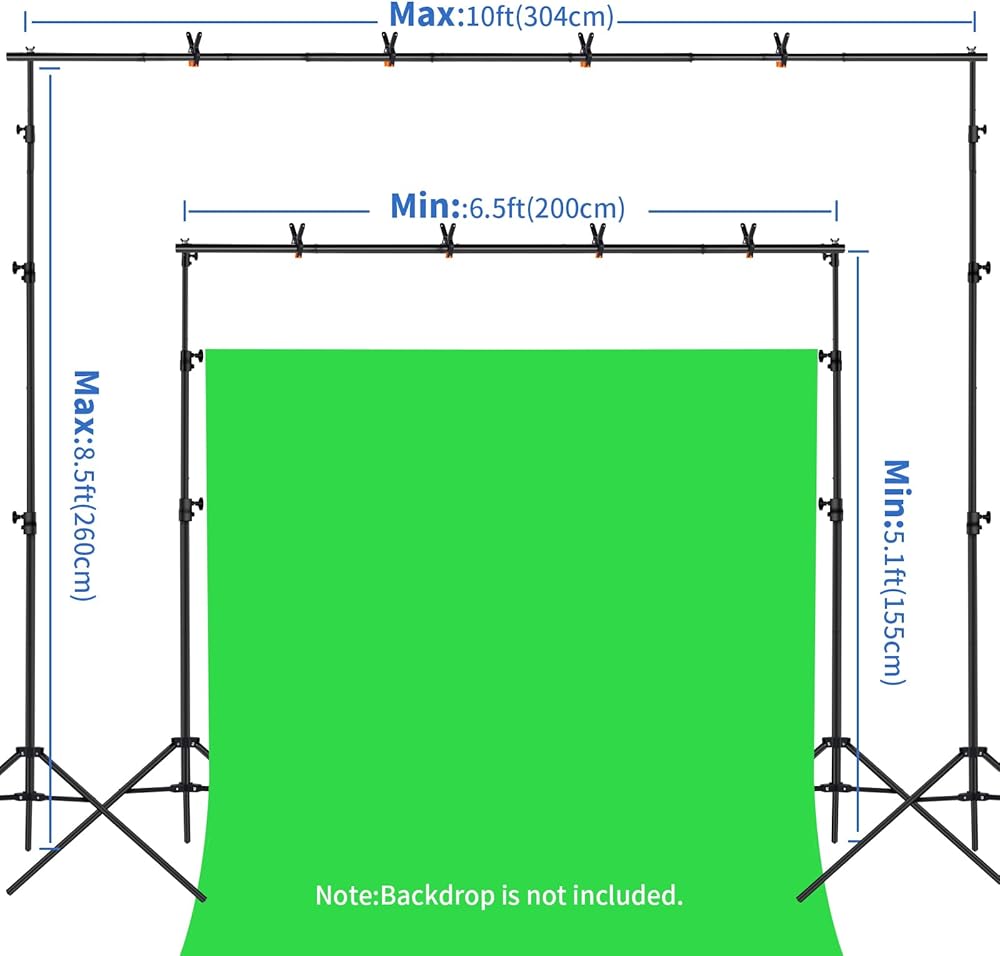 🎥【سهلة التجميع】: سهلة التجميع من قبل شخص واحد دون أي أدوات. حامل الخلفية قابل للتعديل في الارتفاع (5.1 قدم على الأقل - 8.5 قدم كحد أقصى) والعرض (5 أقدام على الأقل - 10 أقدام كحد أقصى). يحمل حامل الخلفية الخاص بك في مكانه للمساعدة لك وظائف التصوير الفوتوغرافي الخلفية المختلفة.