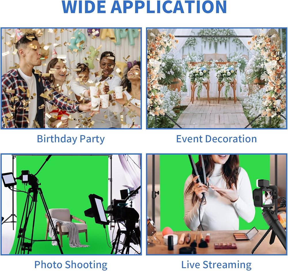 🎥[قابلة للتطبيق على نطاق واسع]: مجموعة حامل الخلفية قابلة للتطبيق على نطاق واسع جدًا، ومناسبة للتصوير الفوتوغرافي، وتصوير الفيديو، وعرض المنتج، وتزيين الحفلات، وتزيين الزفاف وتزيين المنزل. سواء كان ذلك للمناسبات الداخلية أو الخارجية، يمكن أن يلبي حامل خلفية الصورة كل احتياجاتك.