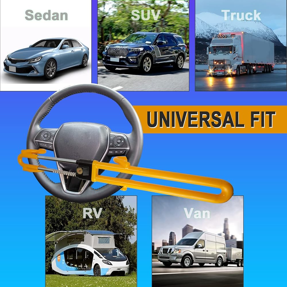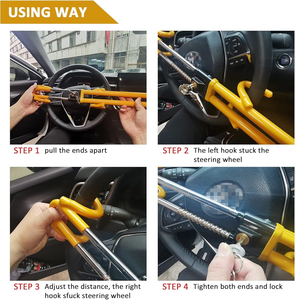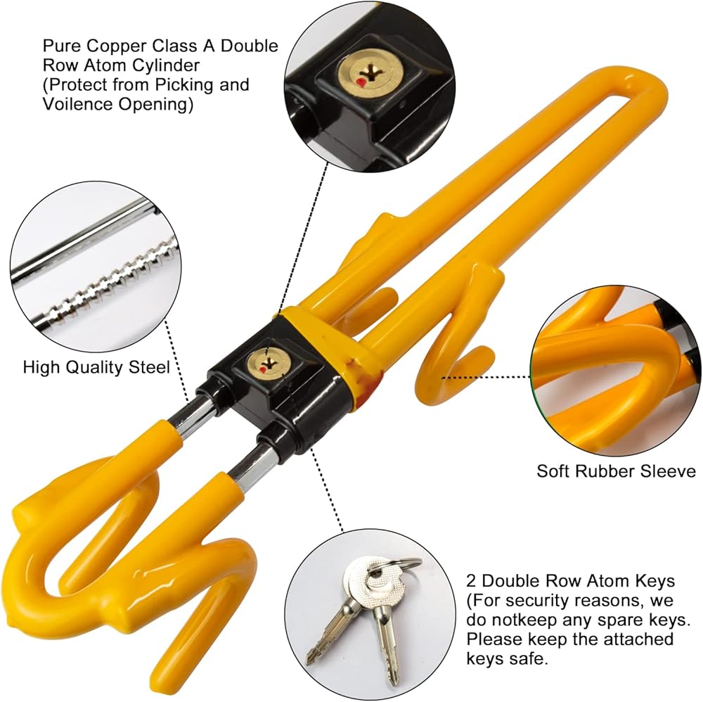 • 【قفل متطور مضاد للسرقة】: قفل عجلة القيادة الأصفر المضاد للسرقة مصنوع من الفولاذ والألومنيوم عالي الجودة، ورافعة القفل الصلبة أقوى! مفتاح مشفر من نوع قفل هلالي مزدوج دقيق، مصمم خصيصًا لمنع اللصوص المحترفين من فتح بعضهم البعض! تتم معالجة جسم قفل عجلة القيادة المضاد للسرقة بالكامل بعملية تشريب بلاستيكية لن تلحق الضرر بعجلة القيادة الخاصة بك.