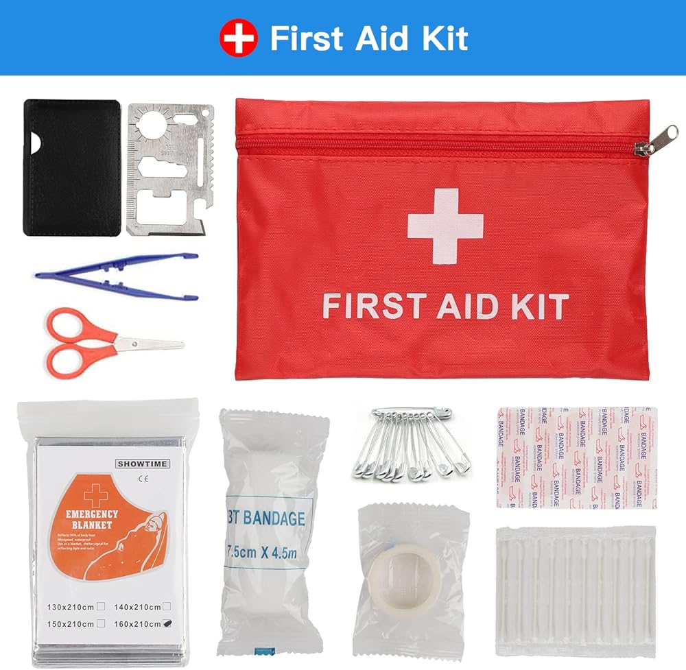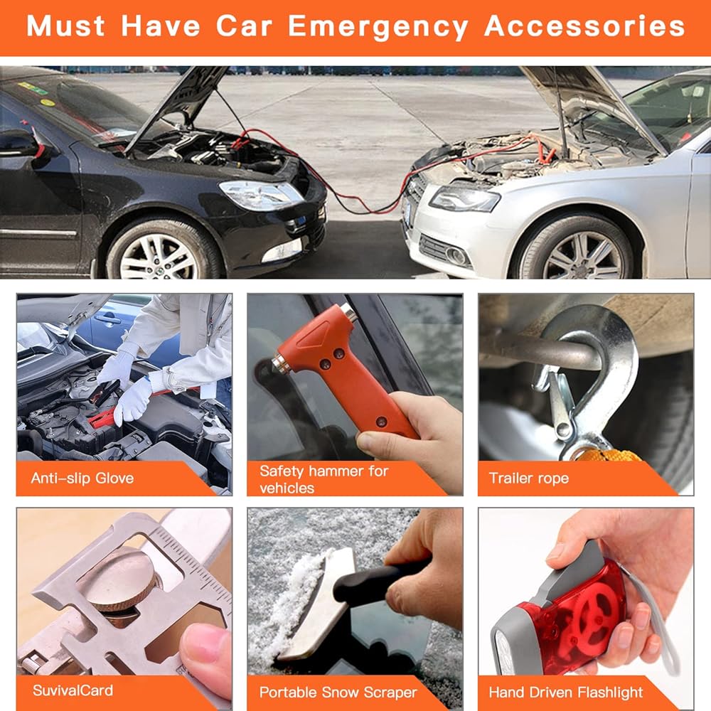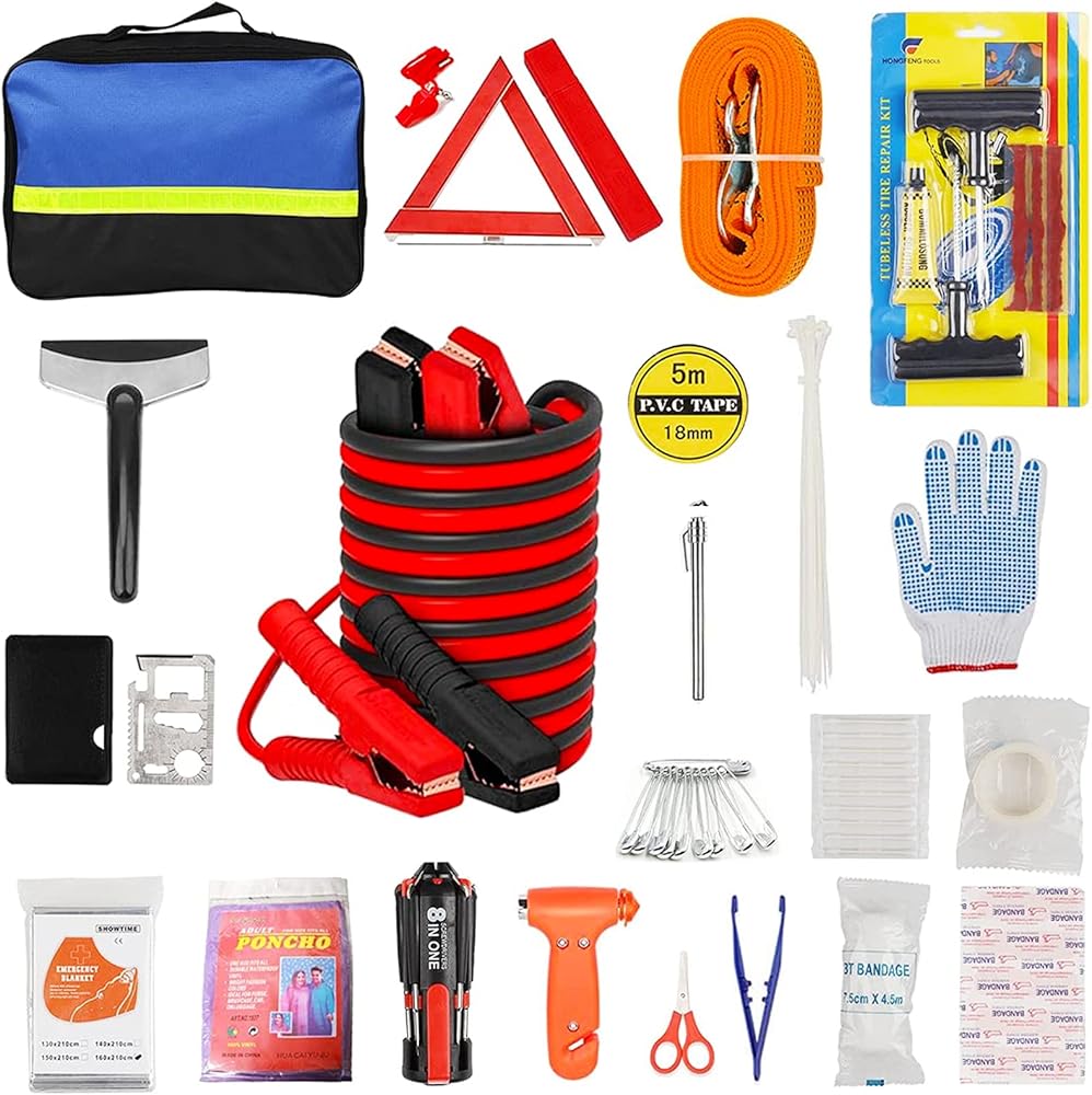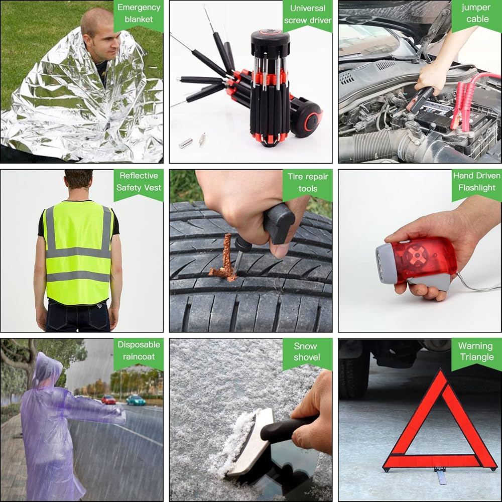 • 【Safety First】The compact and practical car emergency roadside kit is a must have in case of emergency. It has nearly everything you need, includs Jump Cables, First Aid Kit, Tow Rope, Safety Hammer, Reflective Warning Triangle, Tire Pressure Gauge, Safety Gloves, Hand Driven Flashlight, Tire Repair Kits, Screwdriver, Rain Coat, Whistle, Protable Snow Scraper, Emergency Blanket, PVC Tape and Cables Ties.