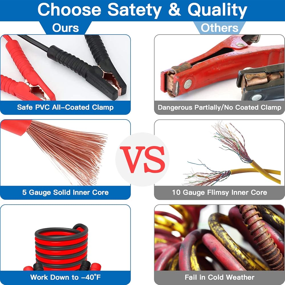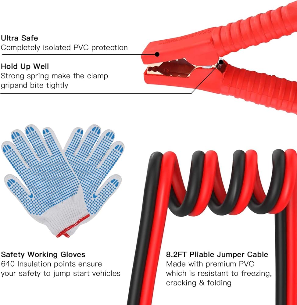 • 【Full-coated Jumper Cables】 The surface of these jumper cable clamps is all covered with premium PVC to be anti-freezing, anti-cracking, and anti-tangling. 4 giant alligator clamps with strong jagged teeth and springs for excellent grip force. 6 gauge thick inner core can work fine even in cold winter. Other accessories are also made of sturdy materials, more reliable and safer!
