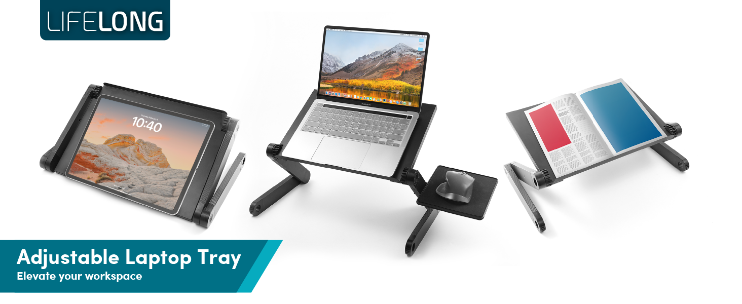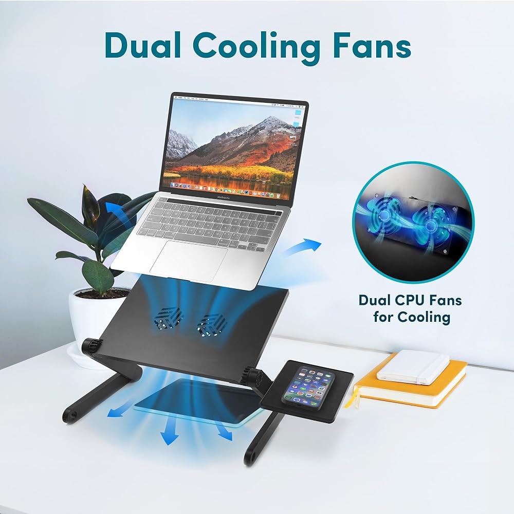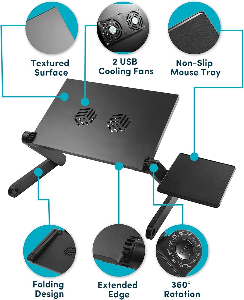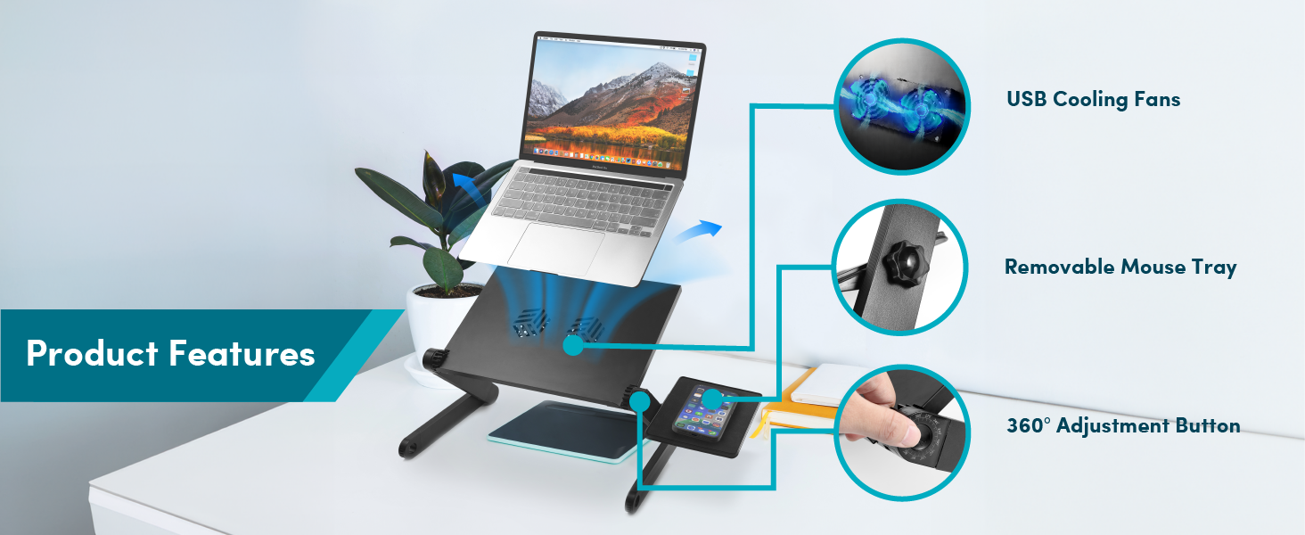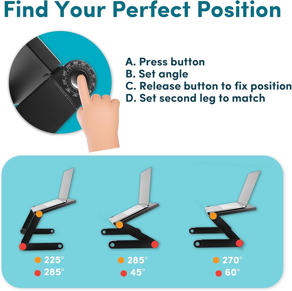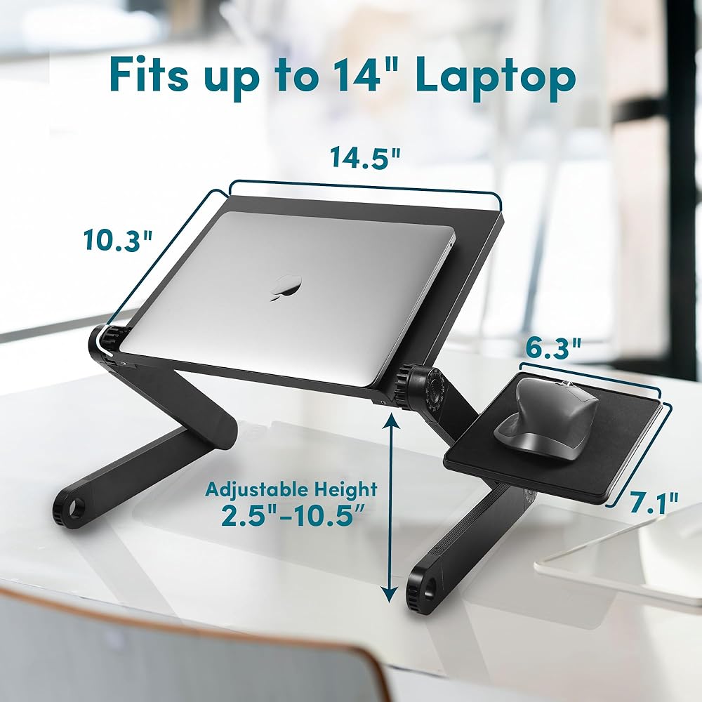 مكتب كمبيوتر محمول قابل للتعديل - أرجل قابلة للتعديل بالكامل تدور 360 درجة وتقفل بزوايا مختلفة. سواء كنت جالسًا أو واقفًا، ما عليك سوى ضبط ارتفاع الساق (2.5-10.5 بوصة) على الوضع الصحيح هندسيًا - على مستوى العين - لتقليل آلام الرقبة والكتف.