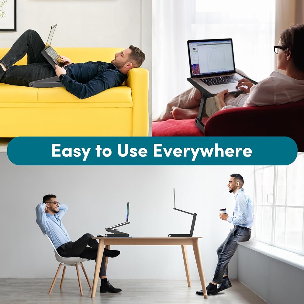 استخدامات متعددة - يمكن استخدام مكتب الكمبيوتر المحمول المحمول هذا كحامل كمبيوتر محمول، أو مكتب قائم، أو مكتب كتابة، أو حامل كمبيوتر لوحي، أو حامل كتب، أو صينية عشاء تلفزيون، أو طاولة معدات صوتية، أو حامل جهاز عرض، أو أقدام غير قابلة للانزلاق يمكن وضعها على السرير أو الأريكة. أو طاولة في المكتب أو في المنزل.