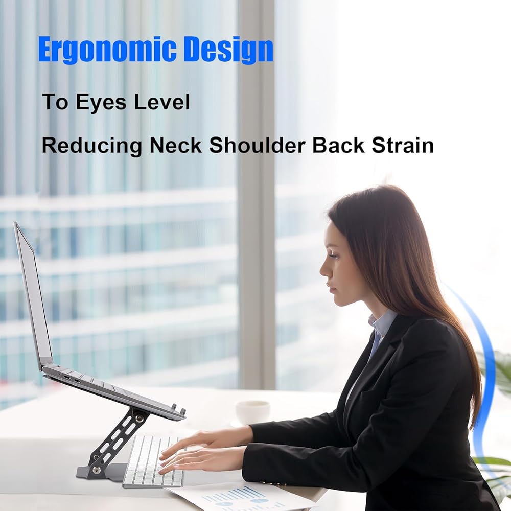 💻【راحة مريحة】 ارفع الكمبيوتر المحمول الخاص بك إلى مستوى العين واستمتع بمساحة عمل مصممة هندسيًا. قل وداعًا لإجهاد الرقبة والظهر.