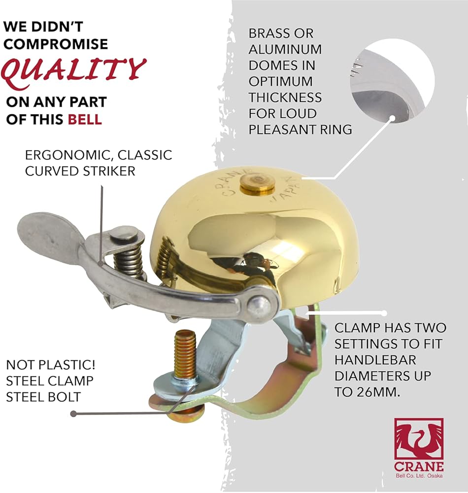 • BEAUTIFUL, RESONANT SOUND: Brass or aluminum alloy dome-shaped bell for a bright and pleasant ring. The ring of a brass bell resonates longer vs other materials. Crane Bell knows the pleasantness of the ring should come second to safety and loudness, but we choose to make BOTH a priority.
