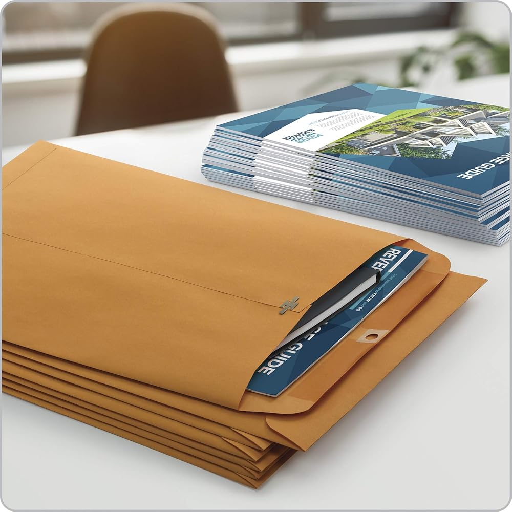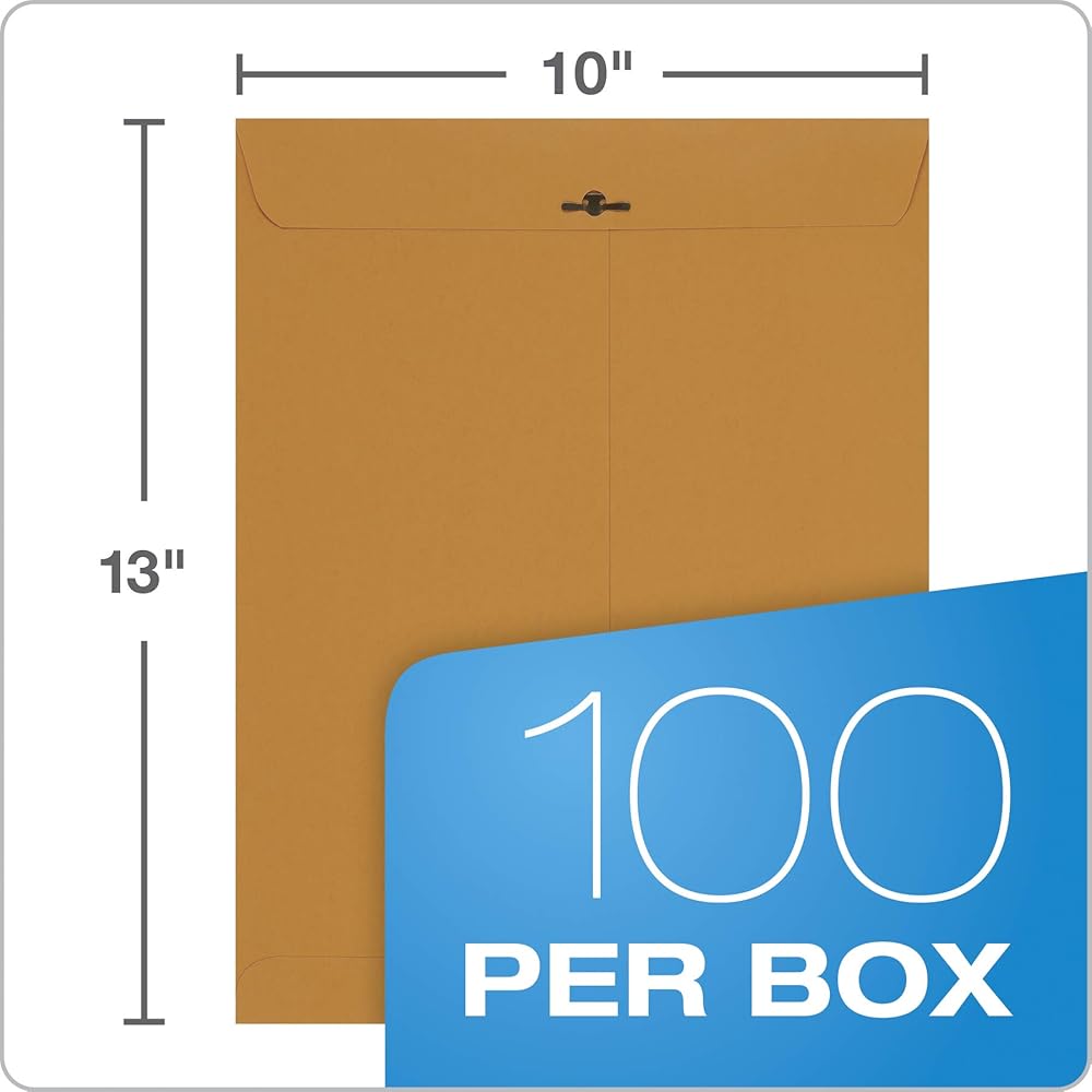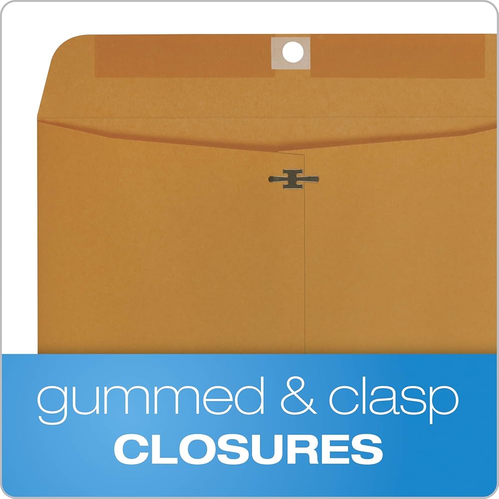 A durable MULTI-PURPOSE envelope. Dual purpose seal allows for multiple uses. Use the moisture activated gummed seal for mailing or the strong metal clasp for repeated use and storage purposes. Features: Heavy-duty opaque 28lb brown kraft material provides privacy of contents. Open end closure. Sized: 10 x 13 Inches. Quantity = 100 envelopes.