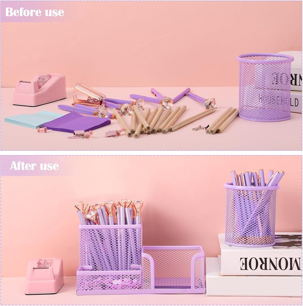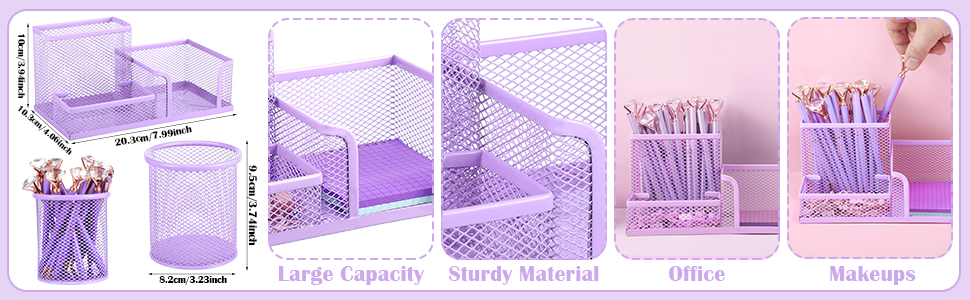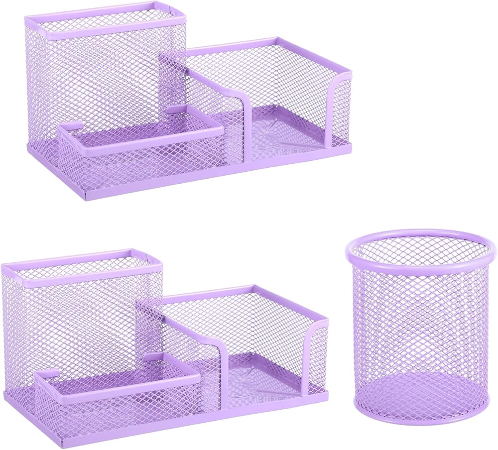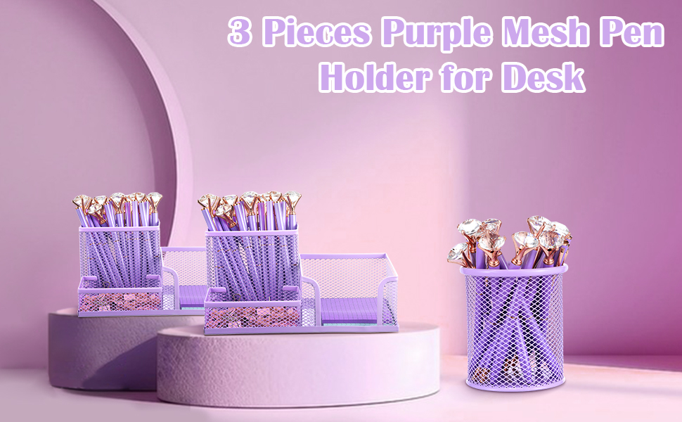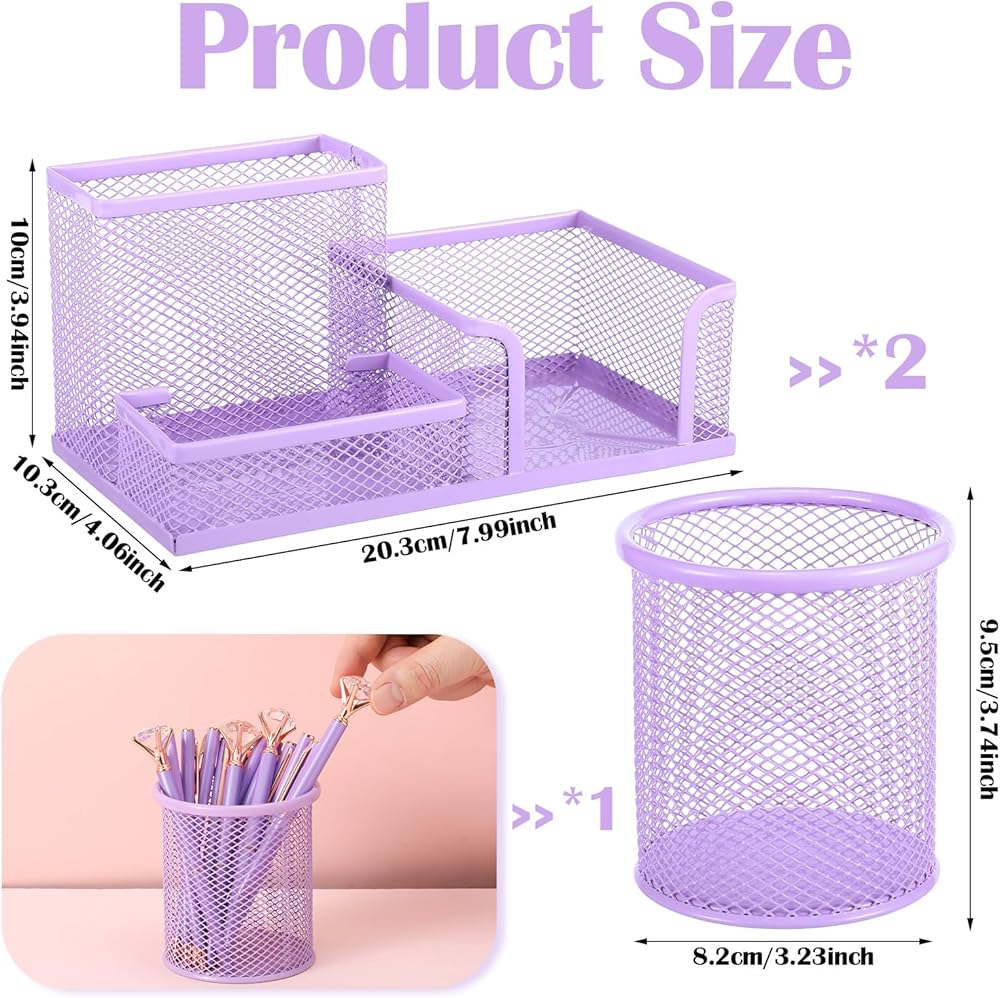 【علبة اللوازم المكتبية】سوف تحصل على حاملي أقلام شبكيين معدنيين متعددي الوظائف مع 3 مساحات وحامل قلم رصاص أرجواني مستدير كلاسيكي لتلبية احتياجاتك في الاستخدام متعدد السيناريوهات. يمكن استخدامها في المنازل والفصول الدراسية والمكاتب وما إلى ذلك.