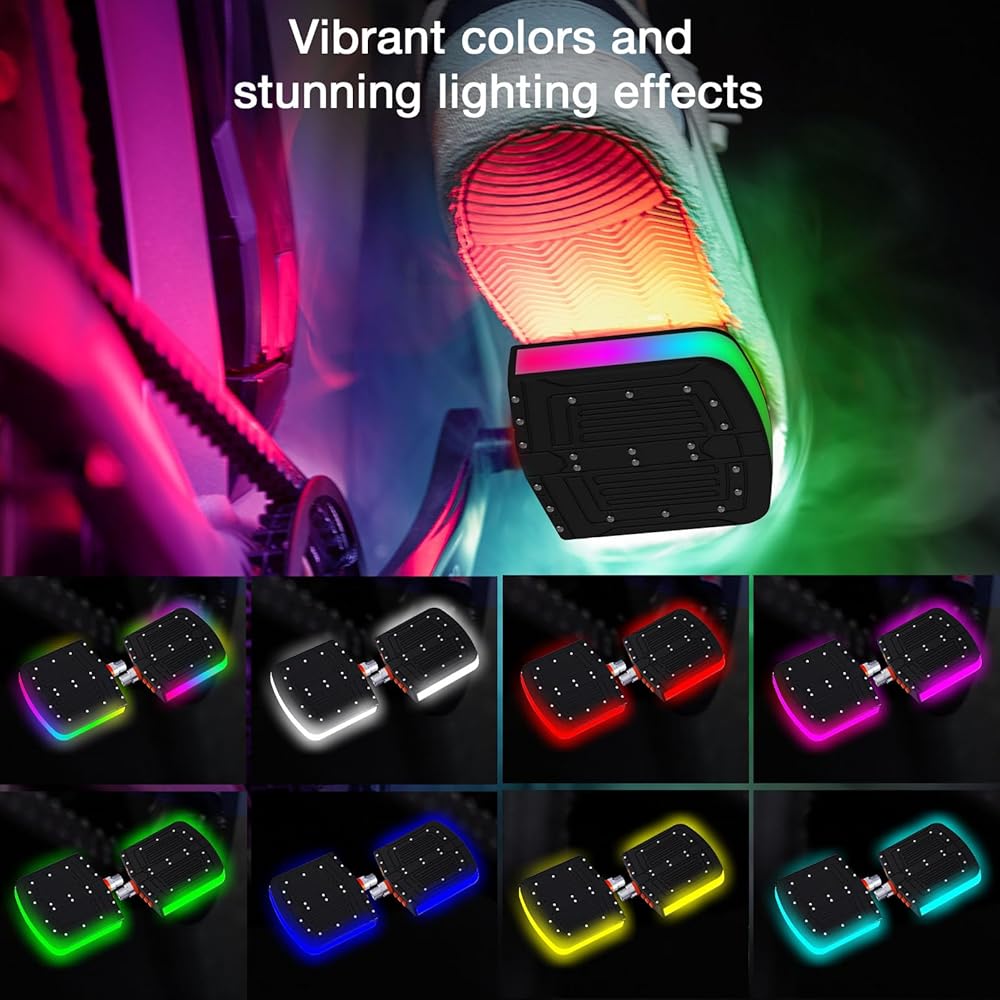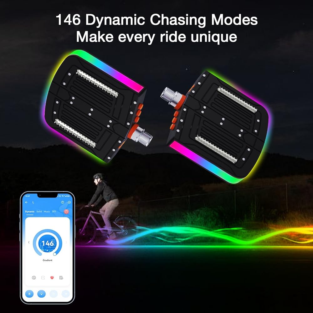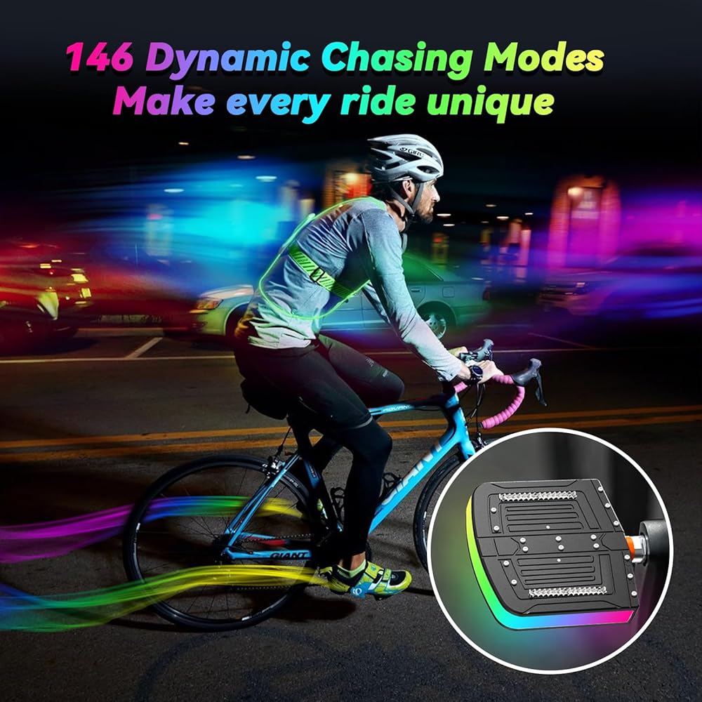 • تأثيرات الإضاءة والسلامة: 146 وضعًا للمطاردة، 18 وضعًا موسيقيًا، 1600 وضعًا أحادي اللون، أوضاع مطاردة مختلفة يمكنك صنعها بنفسك، وألوان إضاءة ساطعة وتنوعات متنوعة. قد تشكل دواسات الإضاءة LED الملونة ذات اللون الحلم تأثير تألق 360 درجة لسهولة التعرف عليها من قبل سائقي السيارات والركاب الليليين أثناء الركوب، وبالتالي تحسين سلامة الركوب وزيادة متعة الركوب.