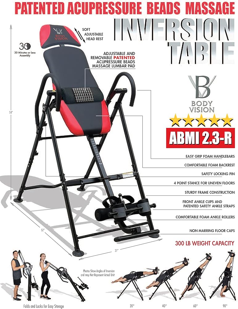 This Body Vision Deluxe Inversion Table incorporates a new Patented Acupressure Beads Massage Lumbar Pad that adjusts along the back pad for lower, middle, upper, shoulder and neck muscle relaxation. An adjustable 5 position head rest, in 1-inch increments, allows for accurate head and neck positioning for users 5'1” to 6'5”. Unlike other inversion tables made from plastic, this model incorporates comfortable structured foam, and a durable cover to ensure ultimate comfort. Sturdy elevated 4 Point Pod Style Frame ensures stability even on an unlevel floor. Be on your way to a better back with the Body Vision ABMI 2.3 Inversion Table. This Inversion Table is tested through Underwriters Labortories ( UL) and is registered with the FDA as a Class 1 Medical Device. Always Check with your Physician before starting any Inversion Therapy and review all Safety Warnings listed in the Owner's Manual before each use.
