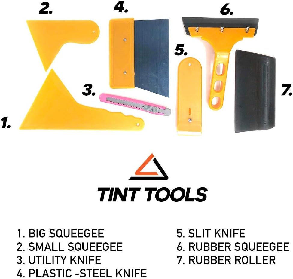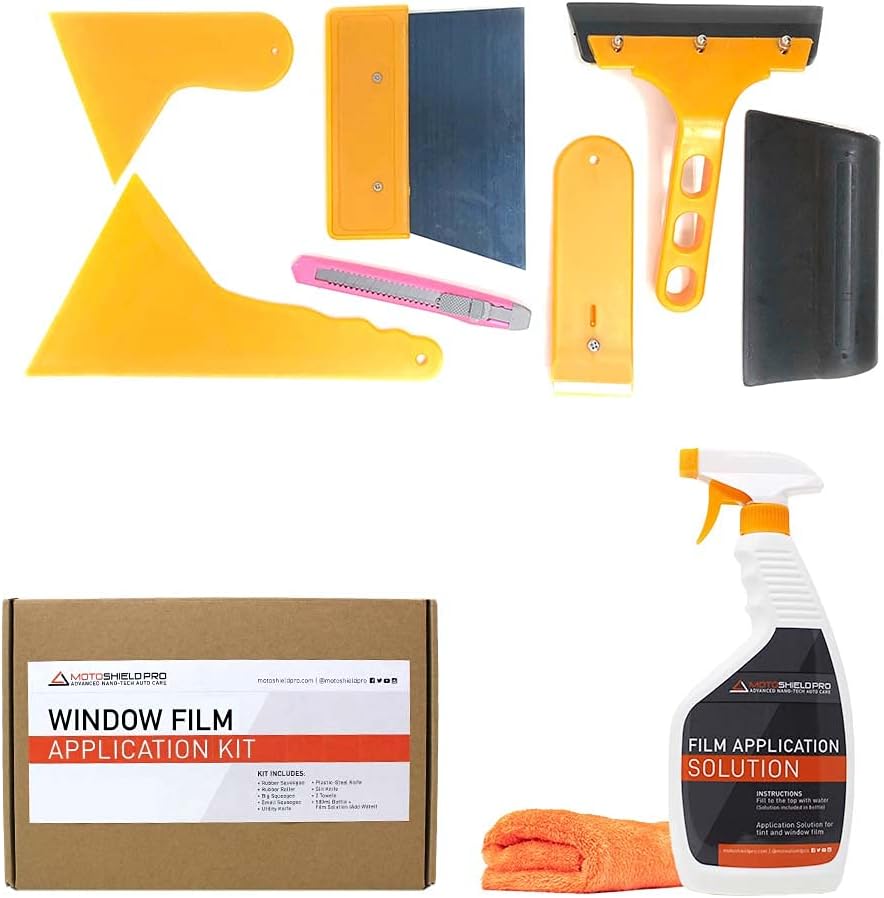 The MotoShield Pro 9-piece window-film car tint application kit is a professional-quality tool for home installation. The kit includes 3 different knives to cut and trim the precut film for an exact fit, and it has 4 squeegee pieces to apply the film without leaving bubbles. It also includes one 16-by-16-inch microfiber towel and a 500-milliliter bottle of tint application spray. With all of these tools, you will be able to create a professional-looking tint job on your car while saving yourself the cost of installation.