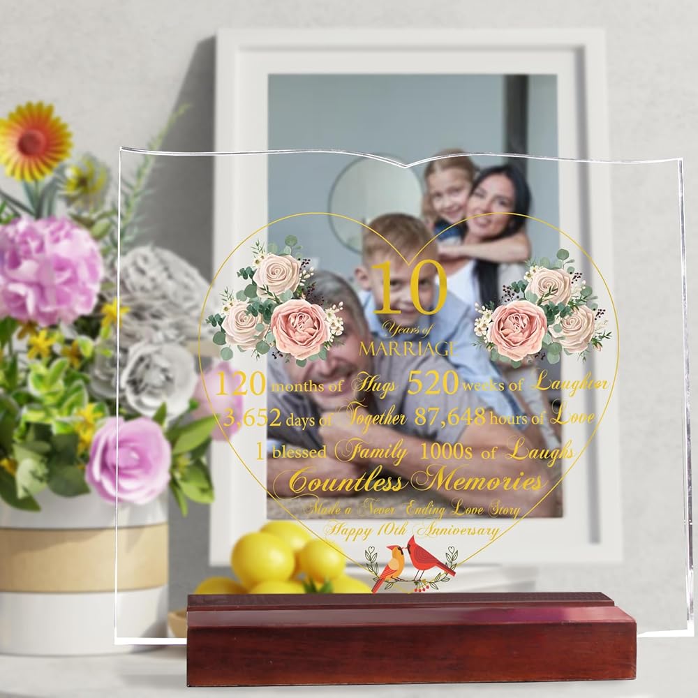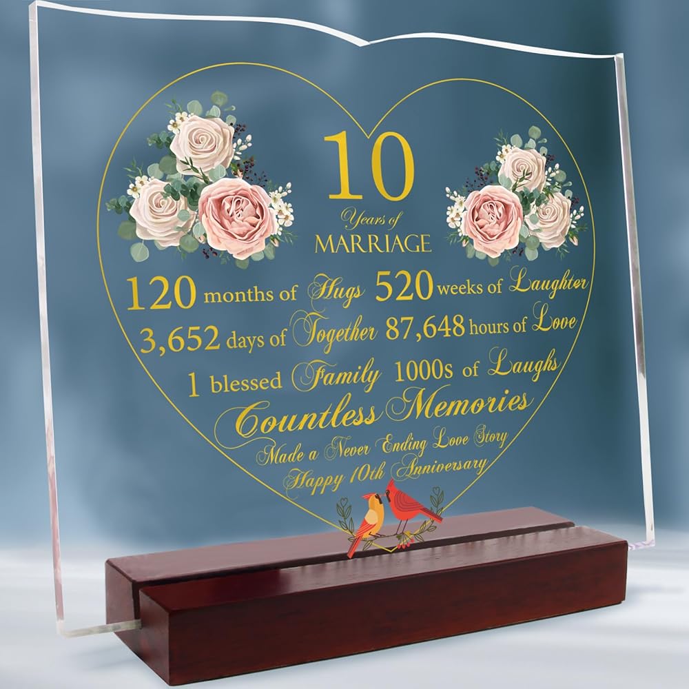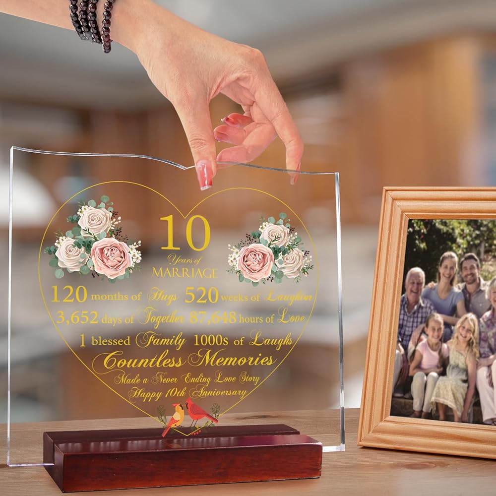 • 10th Wedding Anniversary Gift Ideas: Made of high-quality acrylic and a sturdy wooden base, this decoration is durable and long-lasting. The sturdy base ensures stability and prevents the ornament from falling.