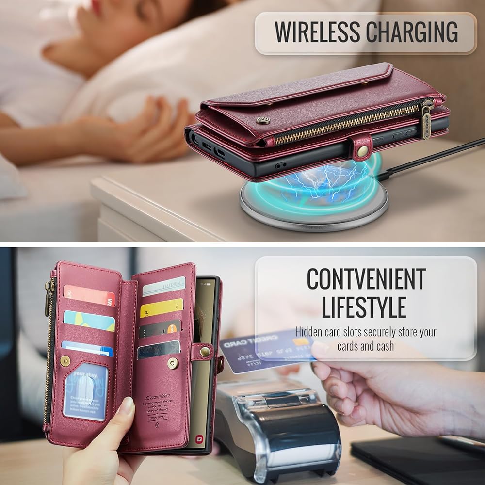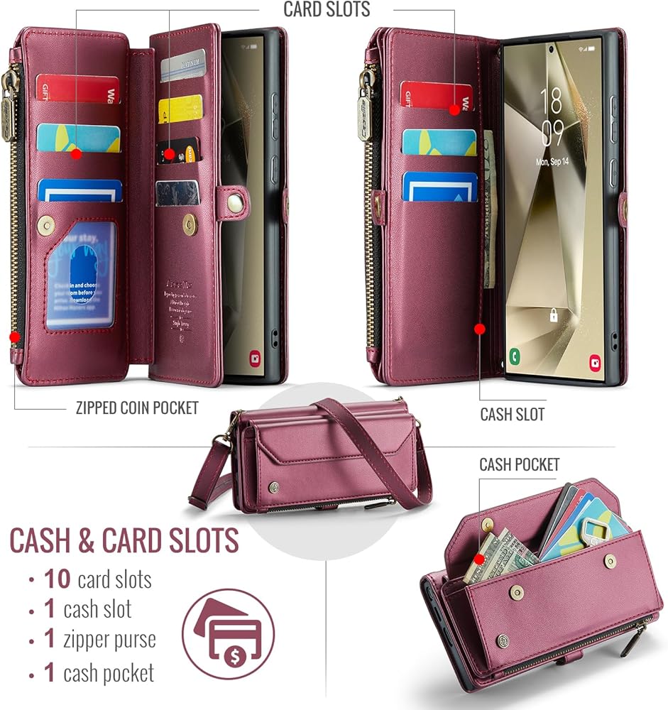 • 10 فتحات للبطاقات + 1 سحاب + 1 معصم + 1 فتحة للنقود: تتضمن حافظة محفظة Galaxy S24 Ultra 10 حامل بطاقات + 1 حقيبة بسحاب + 1 فتحة للنقود، وتحتفظ ببطاقة الهوية وبطاقات الائتمان ورخصة القيادة والفواتير والعملات المعدنية والنقود دون مشاكل . تم اختبار هذا السحاب أكثر من 5000 مرة؛ مع حزام حبل قابل للإزالة، مما يوفر طريقة إمساك اختيارية.