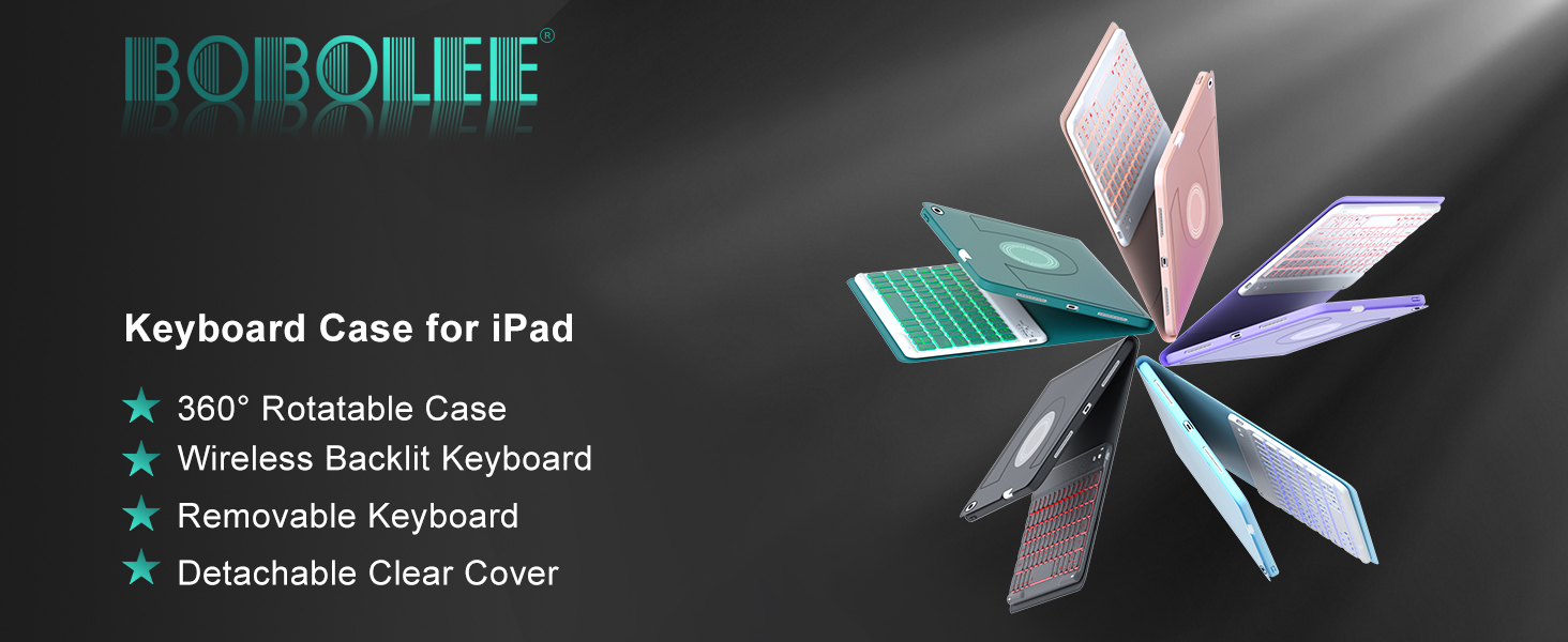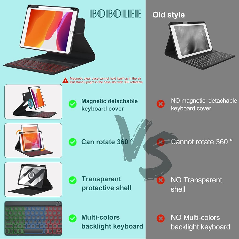 لوحة مفاتيح BOBOLEE الجيل التاسع لجهاز iPad 10.2 بوصة الجيل الثامن والسابع، لوحات مفاتيح لاسلكية بإضاءة خلفية قابلة للفصل، غطاء شفاف قابل للتعديل رأسيًا وأفقيًا وقابل للدوران، حامل قلم مدمج