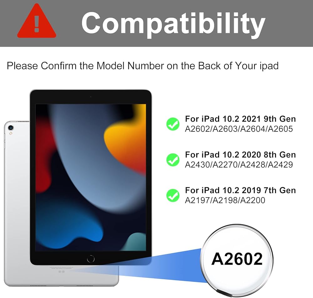 ✨ توافق الحافظة - حافظة لوحة المفاتيح متوافقة مع iPad 10.2" 2021 الجيل التاسع - 2020 الجيل الثامن - 2019 الجيل السابع، بما في ذلك الطراز رقم A2602/A2603/A2604/A2605-A2430/A2270/A2428/A2429-A2197/A2198/ A2200. يمكن طي لوحة المفاتيح مثل الكتاب وفتحها مثل كمبيوتر صغير، سهلة الحمل، وهي مثالية للعمل وتدوين الملاحظات والكتابة في المكتب أو المدرسة أو أثناء السفر. 😄 يرجى التحقق من الجزء الخلفي من أجهزتك قبل الشراء (لا يوجد قلم)