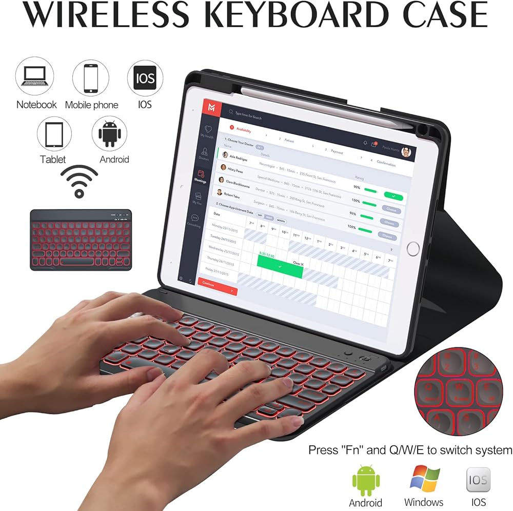 ✨ لوحة مفاتيح بإضاءة خلفية لاسلكية - يتم فصل لوحة المفاتيح المغناطيسية والحافظة، ويتم توصيلهما مغناطيسيًا، ويمكن إزالة لوحة المفاتيح من الحافظة. 3 مستويات من السطوع و7 ألوان نابضة بالحياة تجعل الكتابة ممتعة وسهلة في الظلام أو الضوء. يمكن ربط لوحة مفاتيح iPad 10.2 بوصة بالحافظة مغناطيسيًا، وإذا لم تكن هناك حاجة إليها، يمكن إزالتها. اتصال BT سهل التشغيل