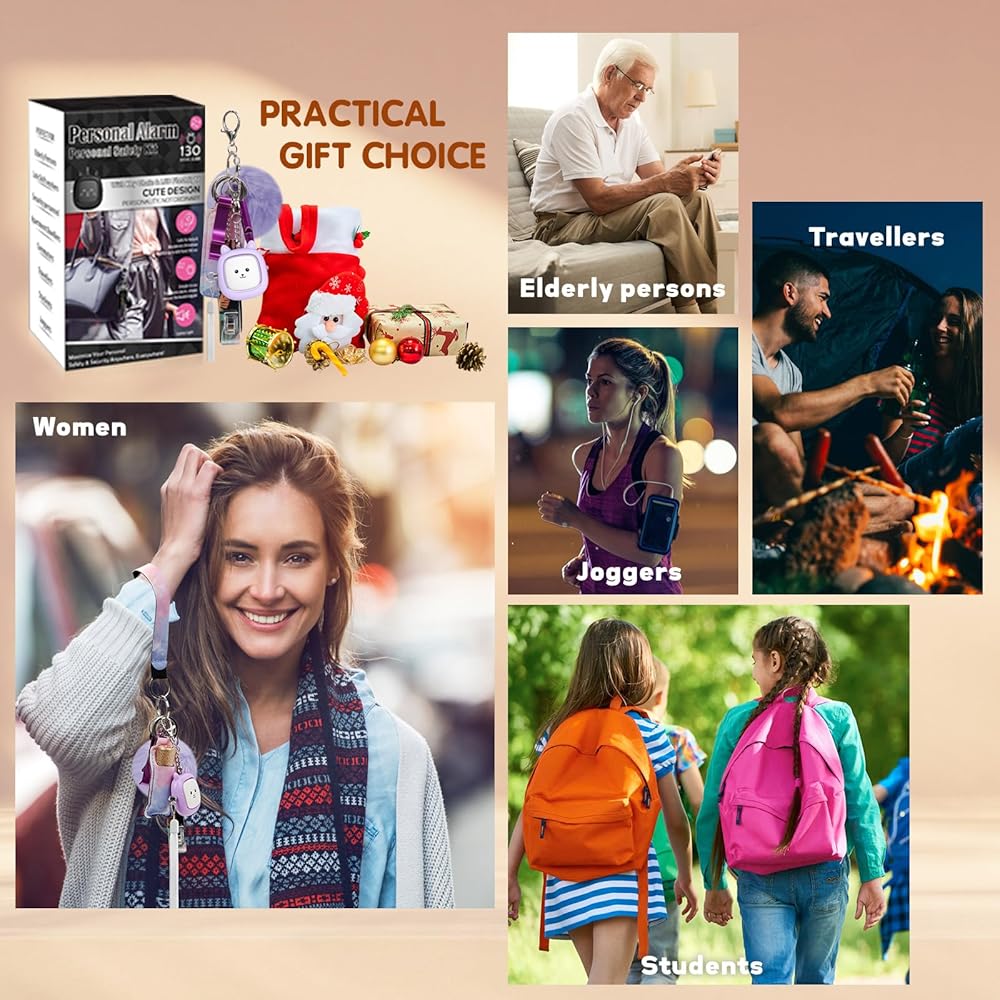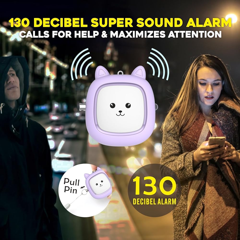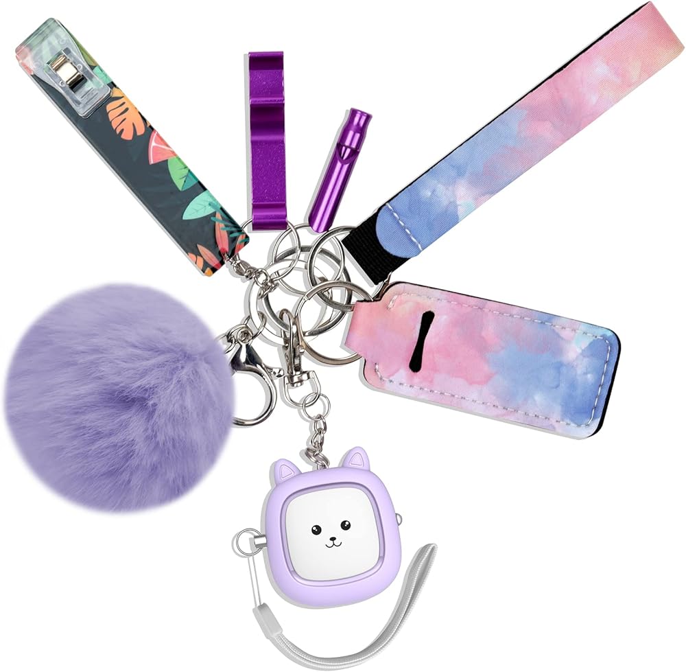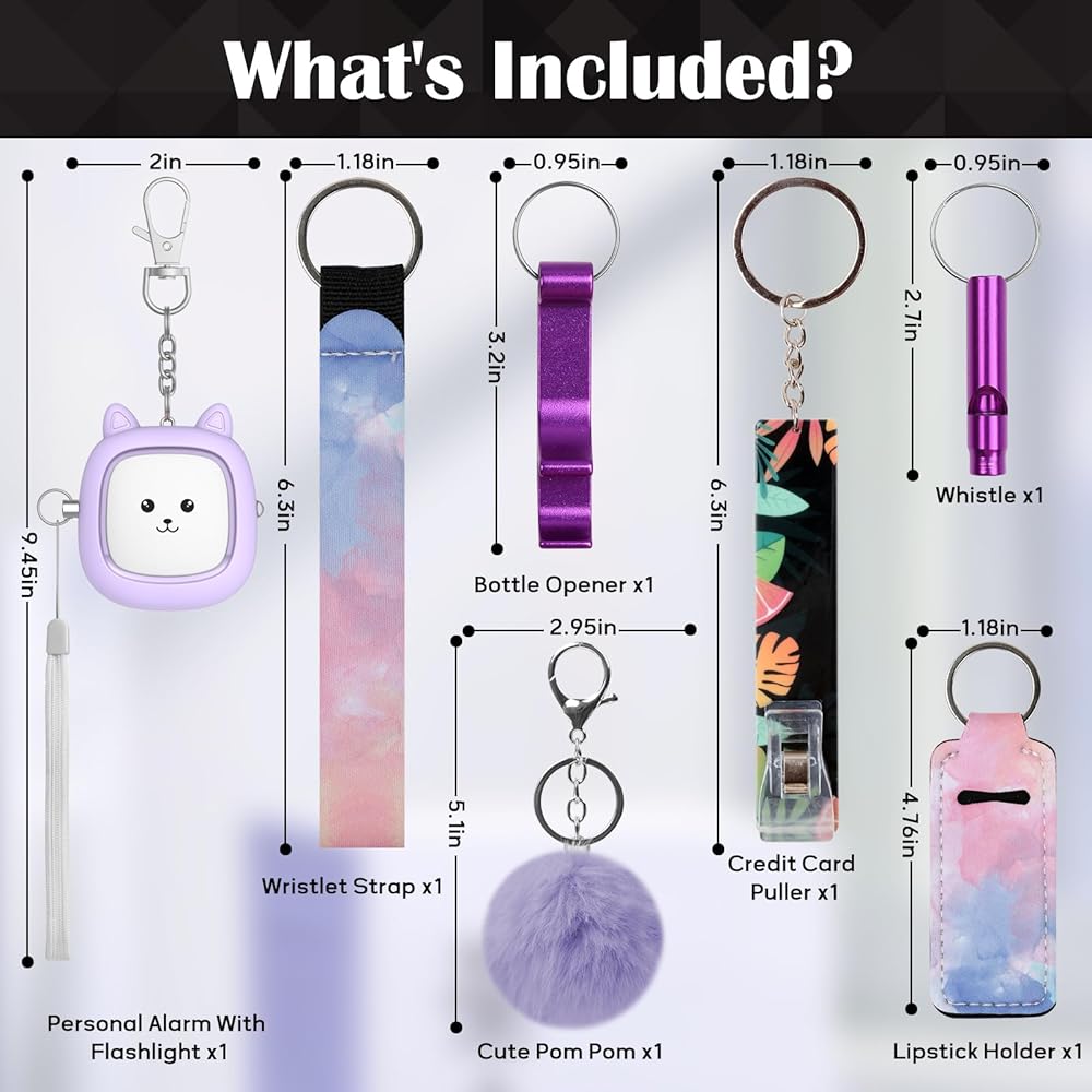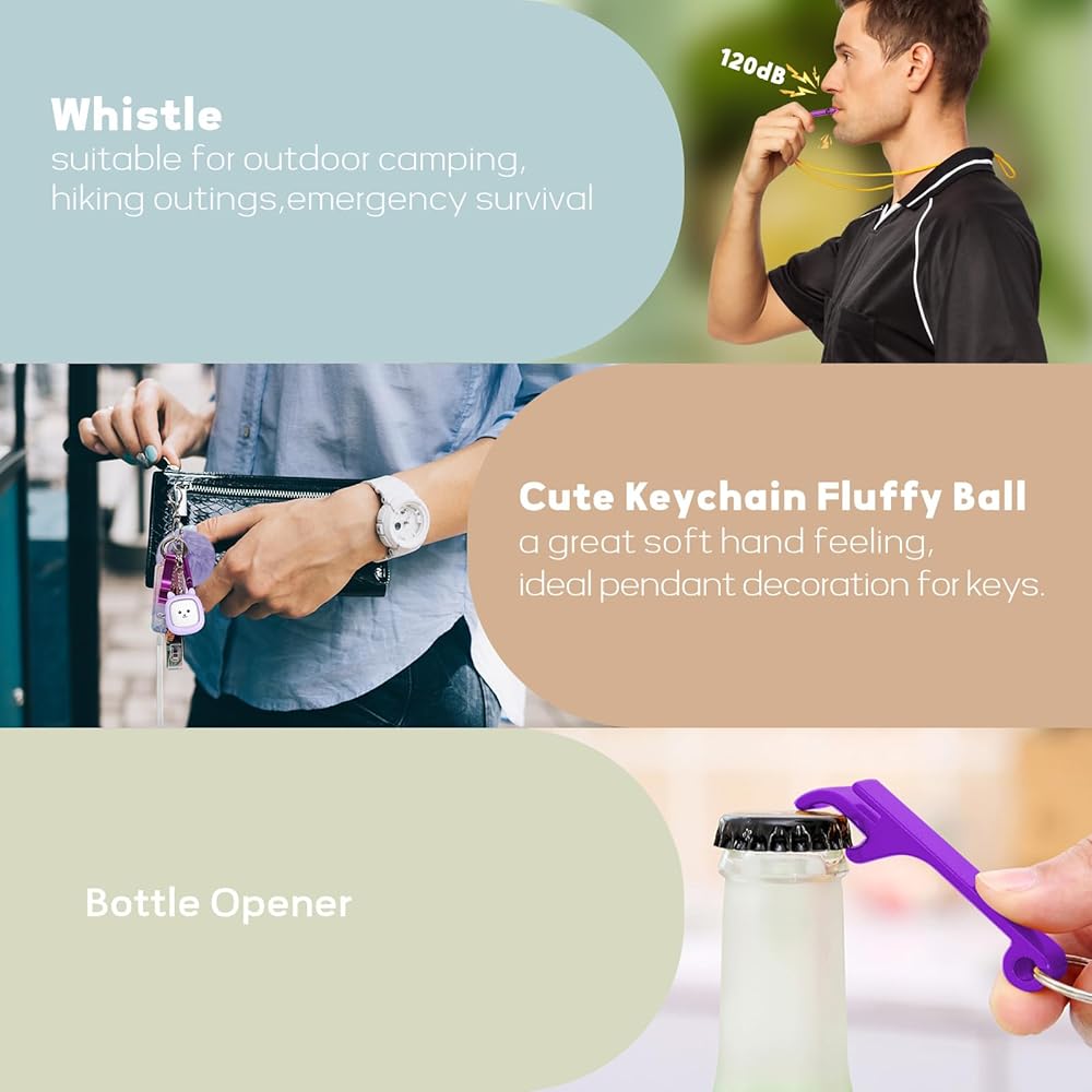 [هدية لها] مجموعة سلسلة مفاتيح إنذار للسلامة الشخصية الجميلة للنساء تتضمن منبهًا شخصيًا لطيفًا مع مصباح يدوي، وصفارة، ومشبك حلقة قفل، وفتحة باب بدون لمس، وفتاحة زجاجات، وبوم بوم لطيف. تغليف أنيق، إنها هدية مثالية لأعياد الميلاد وعيد الشكر والكريسماس وعيد الحب والمناسبات الأخرى.