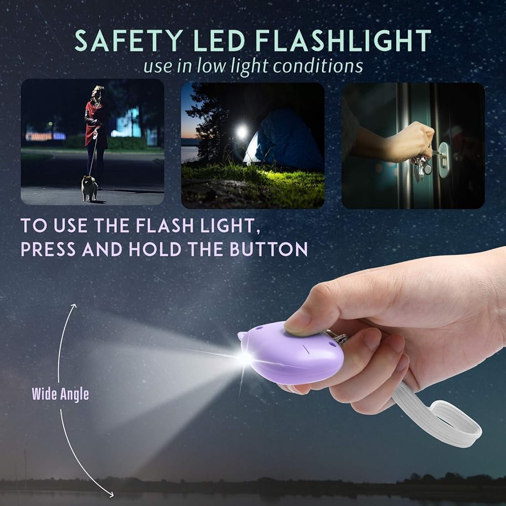 [إنذار الطوارئ 130 ديسيبل] يمكن أن ينبعث إنذار الأمان الشخصي 130 ديسيبل من الضوضاء بشكل كبير أي شخص من حوله، خاصة عندما لا يتوقع الناس ذلك. بالإضافة إلى استخدامه عند الخروج بمفردك، يأتي إنذار الطوارئ هذا مزودًا بمصابيح LED للمناطق غير المضاءة جيدًا. يمكنك استخدامه للعثور على المفاتيح في حقيبة يدك أو قفل الباب الأمامي.
