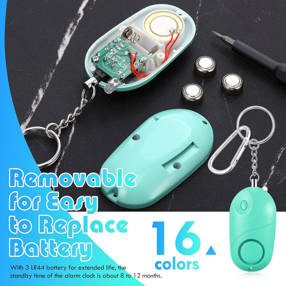 Our personal alarm equips with 3 LR44 batteries for extended life, which can emit a strong alarm sound, effectively helping you out of danger. The standby time of the alarm clock is about 8 to 12 months. The battery is replaceable for your convenience.