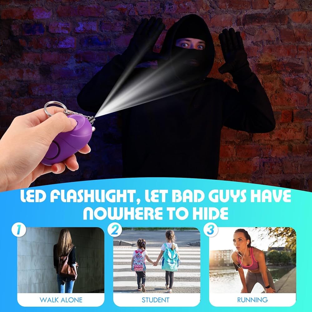 • Built in Led Flashlight: our safety alarm is lightweight and portable for easy storage and carry, so it can be attached to a wallet, bag, schoolbag, backpack, key, belt ring, suitcase, or even your dog's belt while mountain climbing and hiking. Safety alarm contains a built in LED flashlight that bring you light in dark conditions or night adventures