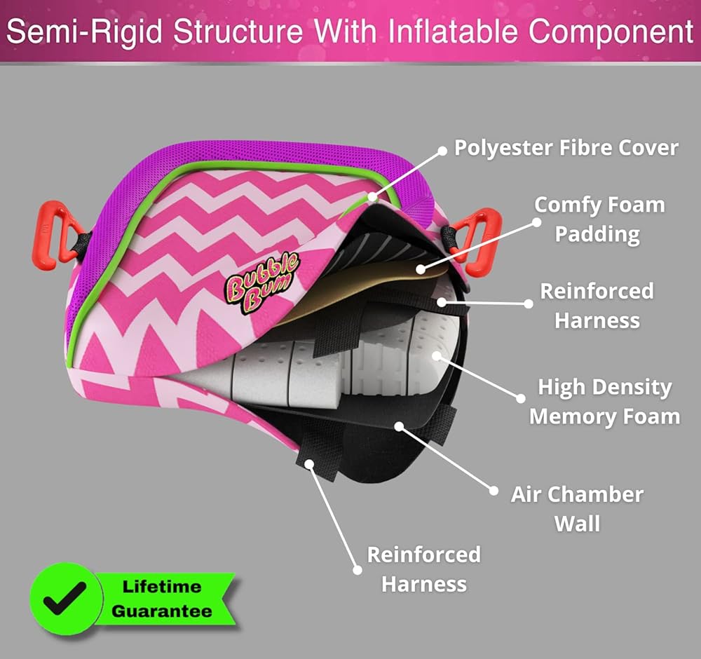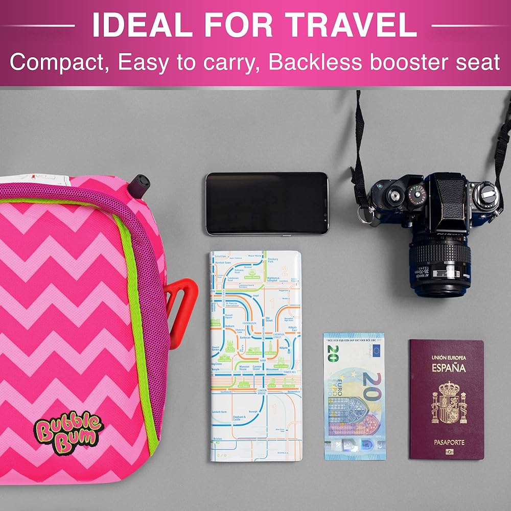 مقعد معزز للسفر في أي مكان - يعتبر مقعد السيارة القابل للنفخ Bubble Bum مثاليًا لتأجير السيارات وسيارات الأجرة والعطلات واستخدام السيارات. خذ مقعدك الداعم الجديد بدون ظهر في جميع مغامراتك. مثالي للأطفال من 4 إلى 11 عامًا.