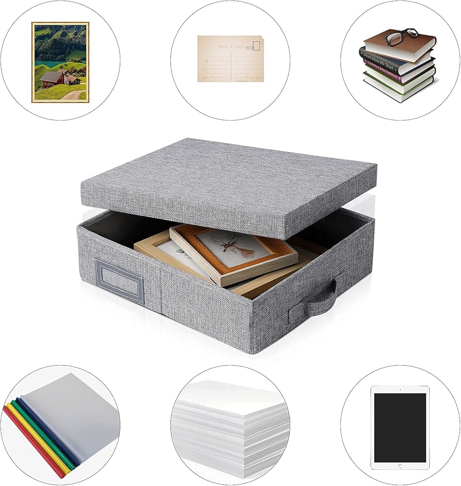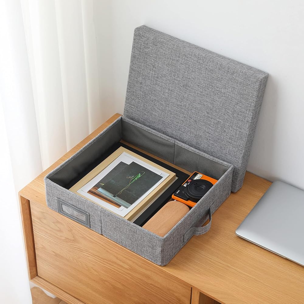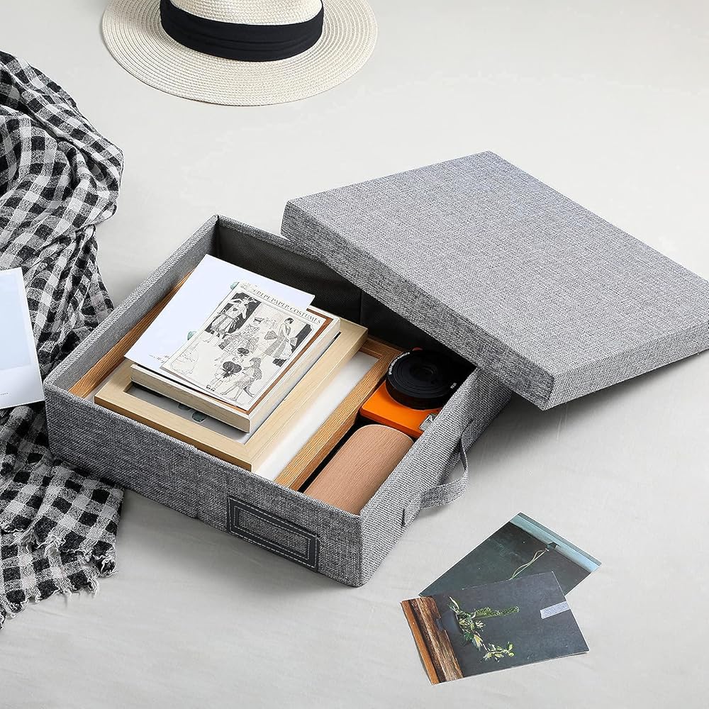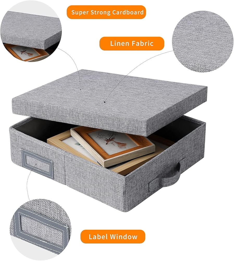 MATERIAL:The scrapbook storage box with lid is made of good quality linen fabrics and inserted cardboard is density cardboard,The surface material and inner card board are durable, fabrics durable material.