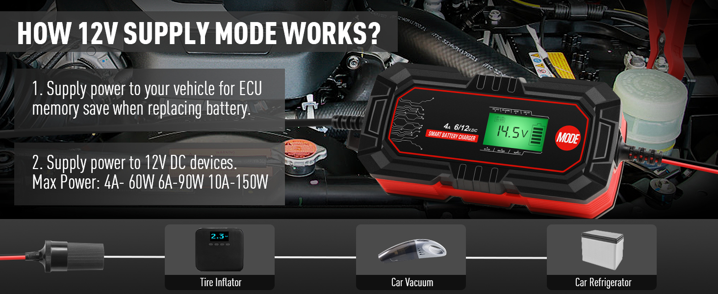 【وضع الإمداد】يمكن أيضًا استخدام شاحن بطارية Sailvoo 4A كمصدر طاقة تيار مستمر لتشغيل بعض أجهزة تيار مستمر 12 فولت (5-14 فولت، 3A أقصى تيار) أو كحافظ للذاكرة عند استبدال البطارية.