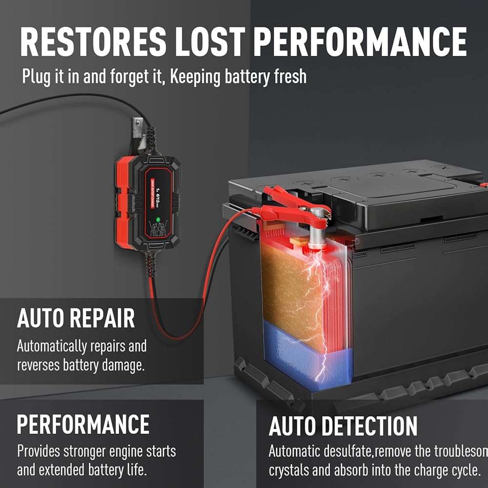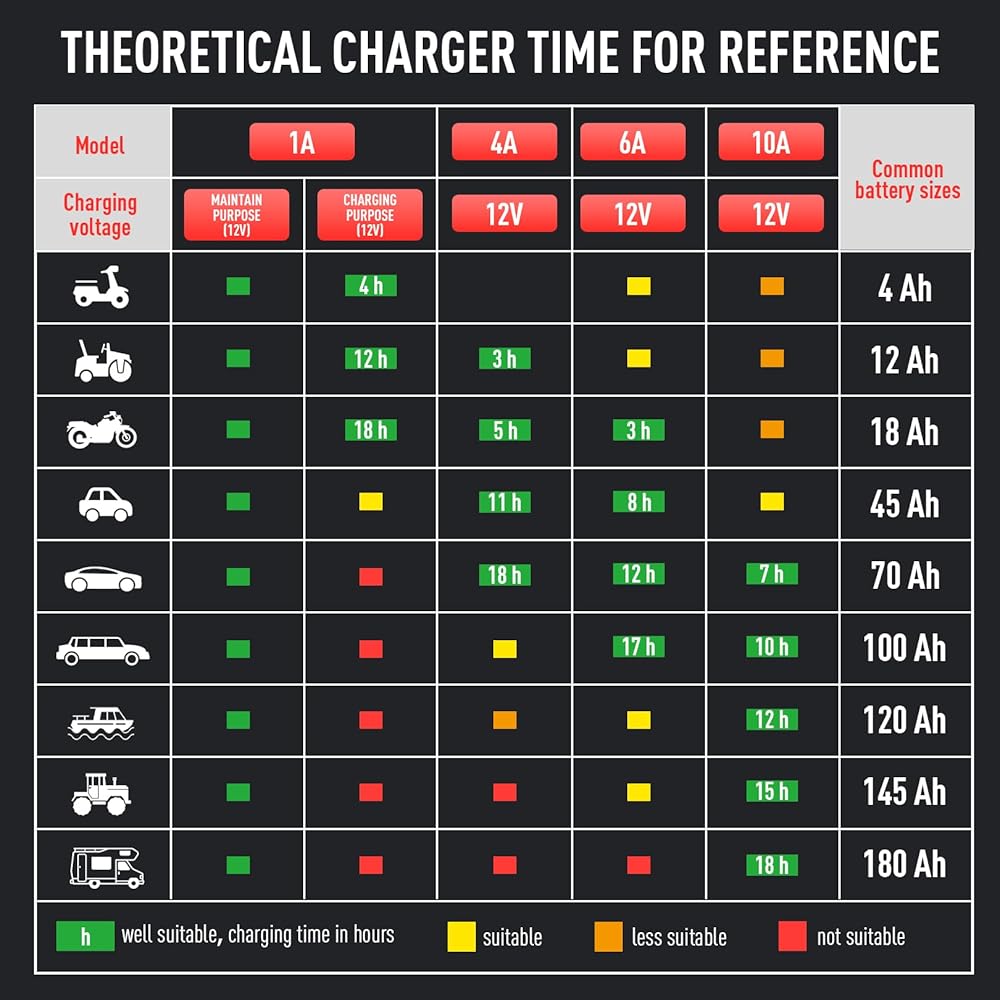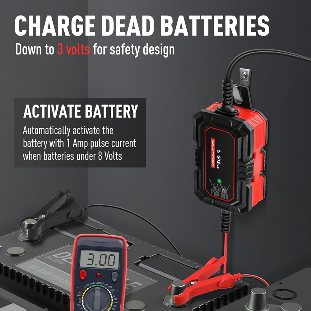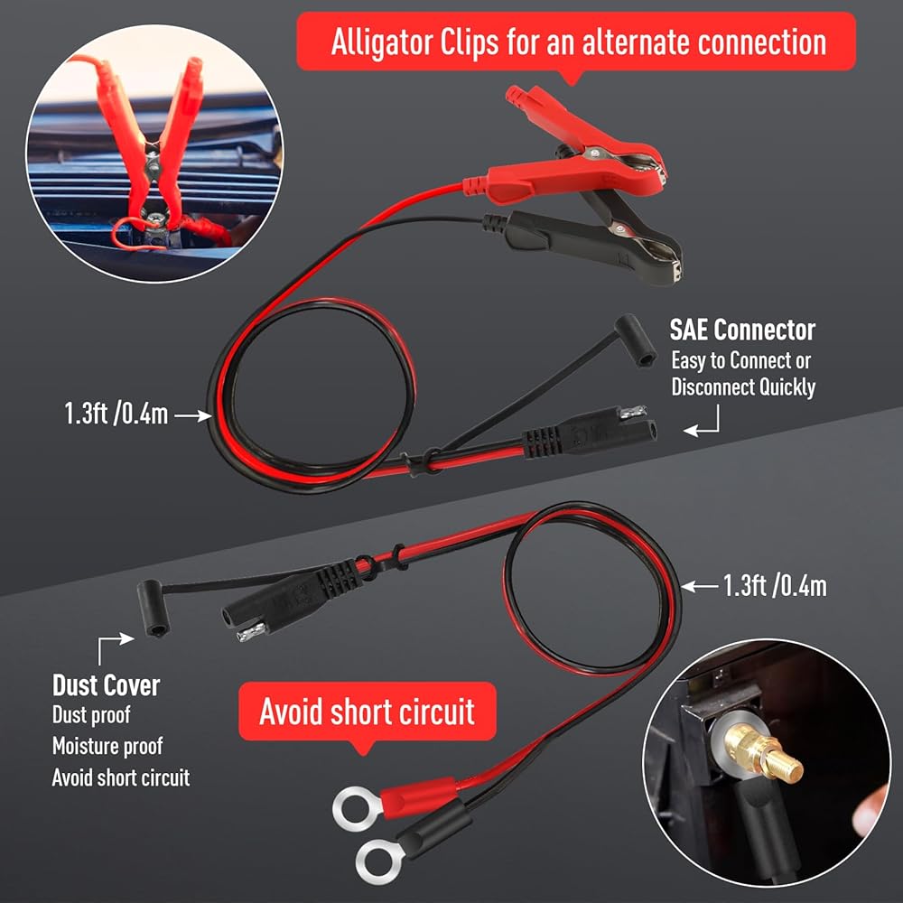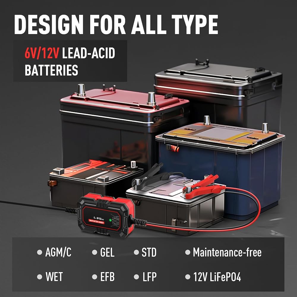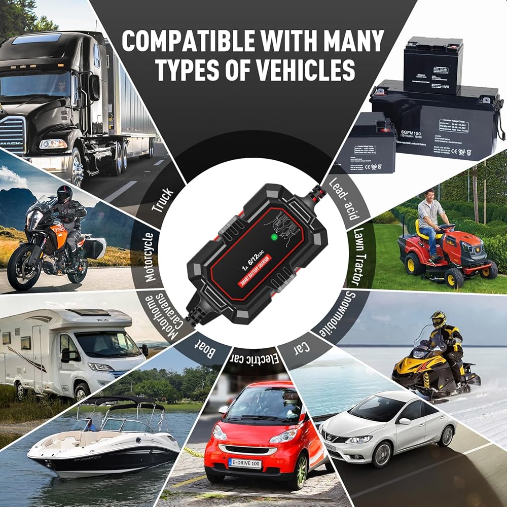 【تطبيق واسع】مثالي لبطاريات الرصاص الحمضية 6 فولت و12 فولت، وبطاريات RV، وPowersport، وبطاريات الدورة العميقة، بما في ذلك البطاريات المغمورة والجل وAGM وSLA وVRLA والبطاريات الخالية من الصيانة والمزيد (بالإضافة إلى بطاريات LiFePO4 بقدرة 12 فولت ) . قم بشحن وصيانة السيارات والسيارات والدراجات النارية والدراجات الترابية والدراجات البخارية والدراجات البخارية وجزازات العشب والمركبات الرباعية وأكثر من ذلك.