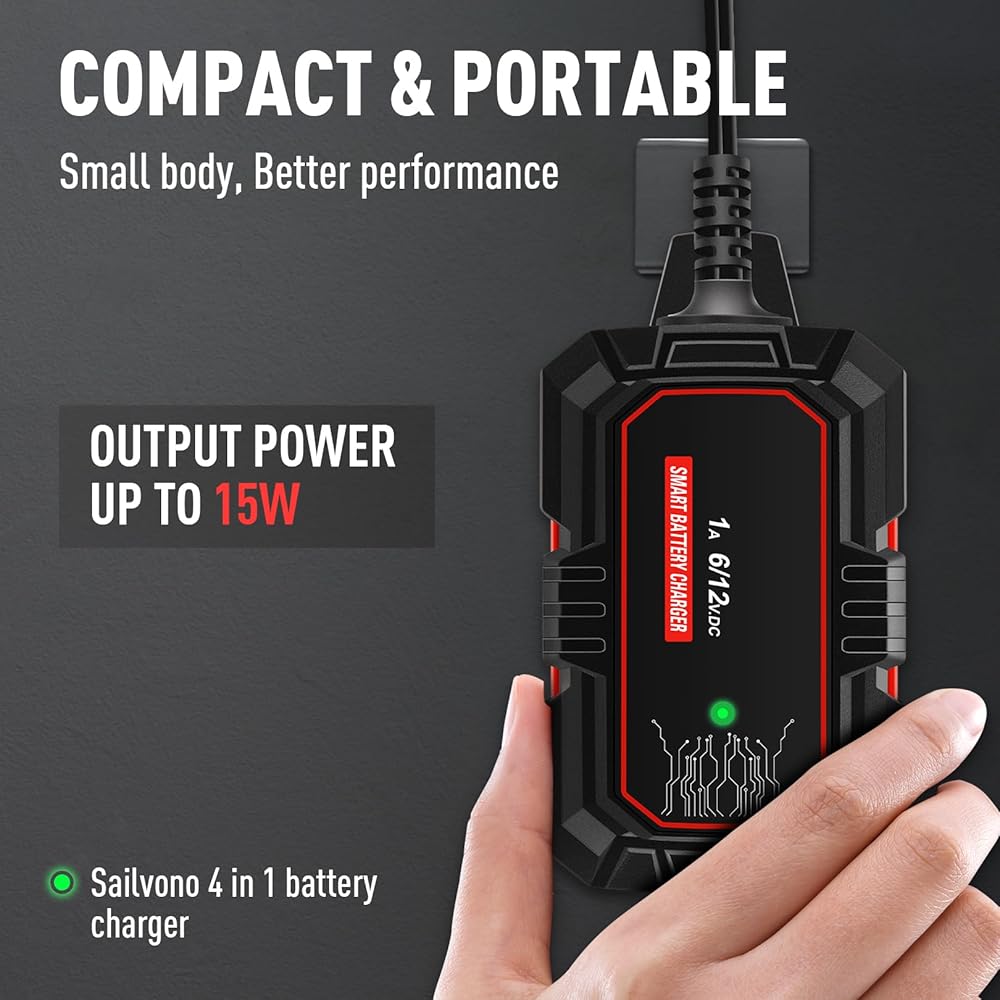【تعرف على شاحن بطارية Sailvono 4A】شاحن بطارية الكل في 1، وحافظة البطارية على 10 مراحل، وشاحن متدرج، ومزيل كبريتات البطارية. مصممة لجميع أنواع بطاريات الرصاص الحمضية 6 فولت و12 فولت (بالإضافة إلى 12 فولت LiFePO4). درجة حرارة التشغيل: -4 درجة فهرنهايت إلى 104 درجة فهرنهايت (-20 درجة مئوية إلى 40 درجة مئوية)