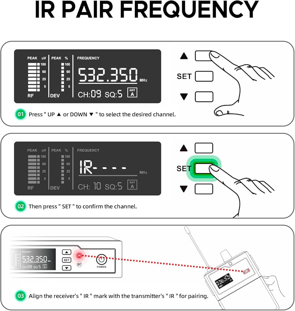 نطاق UHF رائع: يعتمد نظام المراقبة الأحادي داخل الأذن هذا على نقل إشارة صوتية عالية التردد للغاية، مما يحسن الأداء العام، ومضاد للتدهور، ومضاد للتسلسل، وإشارة أقوى وأكثر استقرارًا، ونسبة إشارة إلى ضوضاء أفضل. نطاق التردد هو 510-580 ميجا هرتز. يتم ضبط 100 تردد مسبقًا لكل قناة، والتي يمكن تبديلها حسب الرغبة ولن تنتج تداخلًا حتى عند استخدامها في مجموعات متعددة.