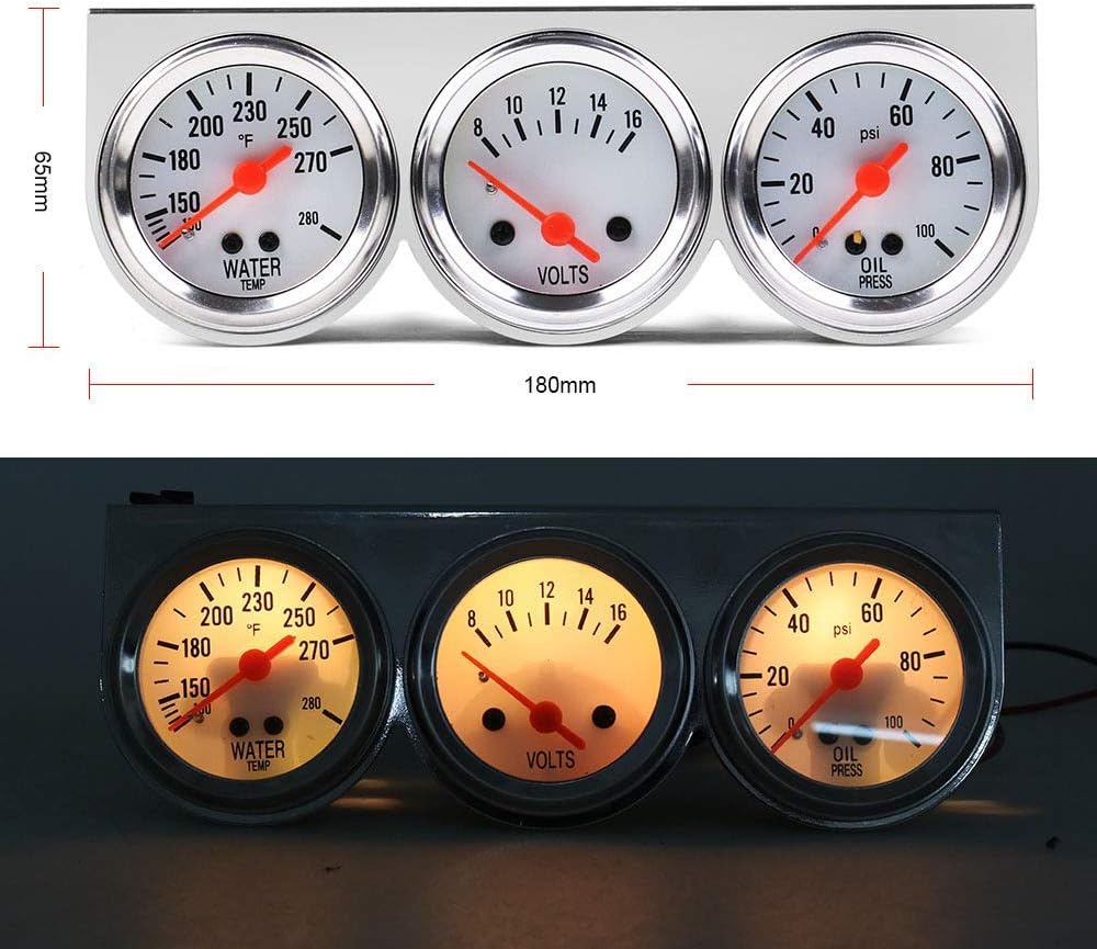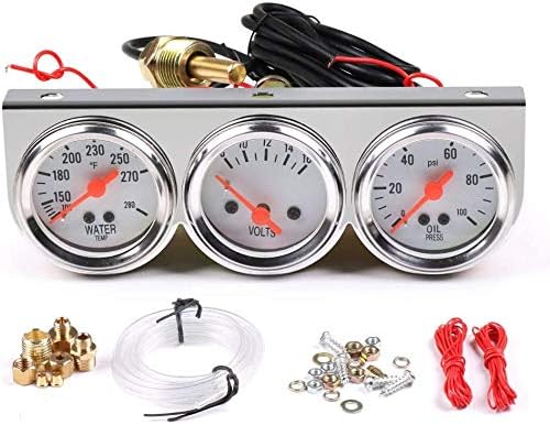 3 in 1 oil pressure, voltage and water temperature Specification: Material: ABS Metal Water Temp Gauge: 100 - 280 ℉ Volts Gauge: 8 - 16V Oil Pressure Gauge: 0 - 100 psi Illuminated Gauges Complete accessories Universal fit for 12V car Fitment: (for reference) - For most hot rods and classics engines, fit for GM - c and so on - Fit 260 265 273 283 289 302 305 307 318 330 326 327 340 360 361 347 350 351W 351C 351M 352 360 383 390 396 400 402 413 426W 427 440 455 454 472 406 427 428 429 460 400M 502 engines. -It's better to measure motorcycle frame own clip tube's specifications before bidding to get the most appropriate spec tensioner. Triple Gauge Kit Oil Volt Water Gauge Chrome Oil Pressure Voltage Water Temperature 3 in 1 Car Triple Meter Auto Gauge Set Fit for CHEVY, FORD, GMC, CADILLAC, OLDS, PONTIAC, BUICK MOPAR DODGE, CHRYSLER, PLYMOUTH