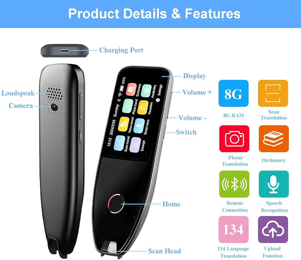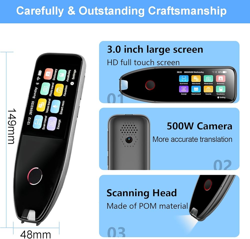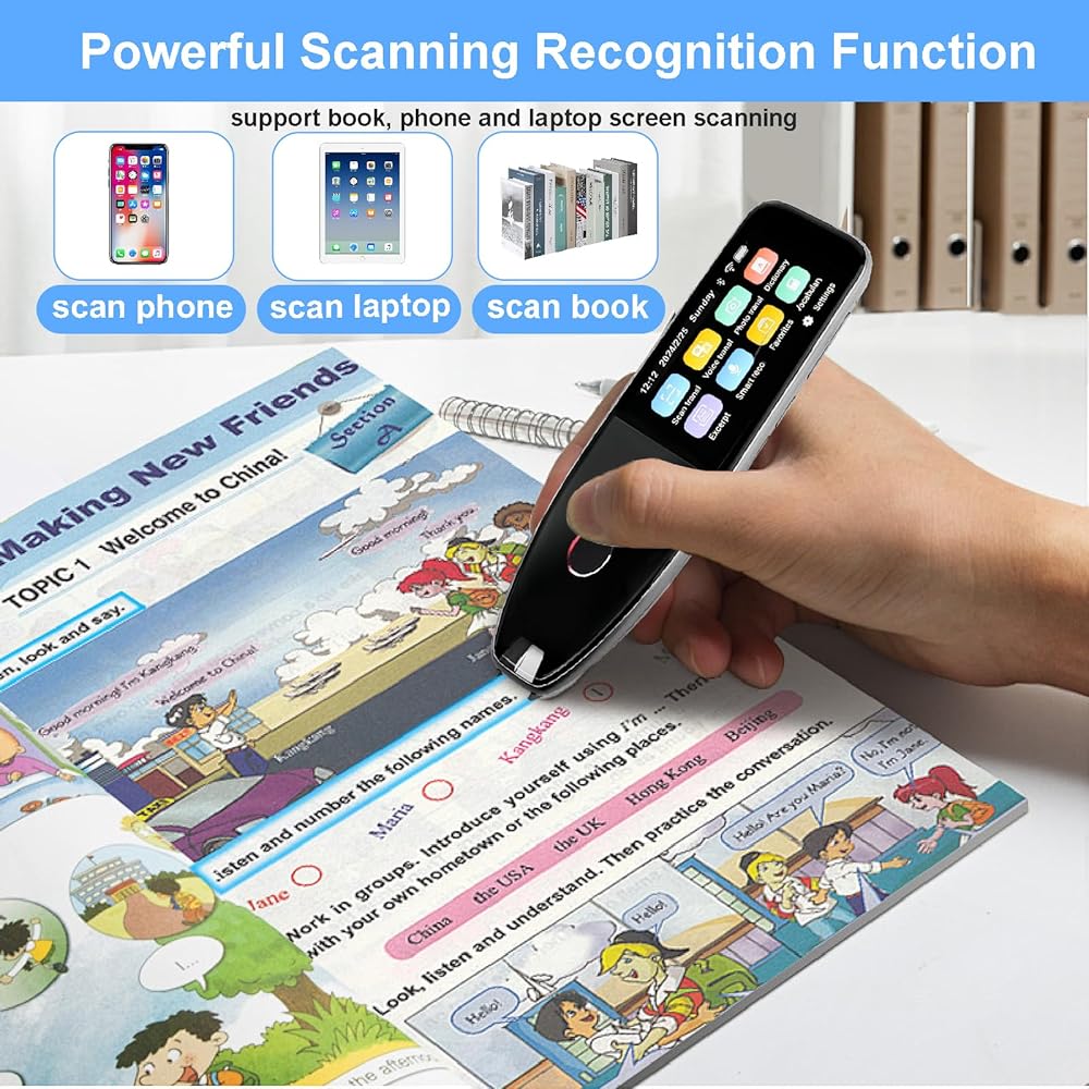 وظيفة ترجمة المسح الضوئي: يتعرف قلم المسح الضوئي على الكلمات المعقدة والجمل القصيرة ويترجمها من خلال إجراءات المسح الخطي، والتي يمكن أن تساعدك على فهم المعنى والنطق. تشغيل شاشة اللمس أكثر ملاءمة للاستخدام، مما يوفر لك وقت القراءة أو التعلم.
