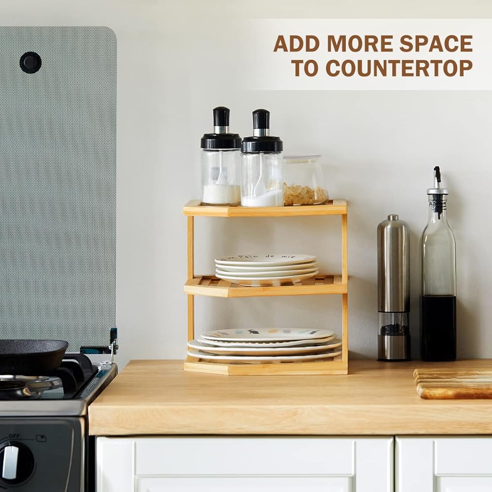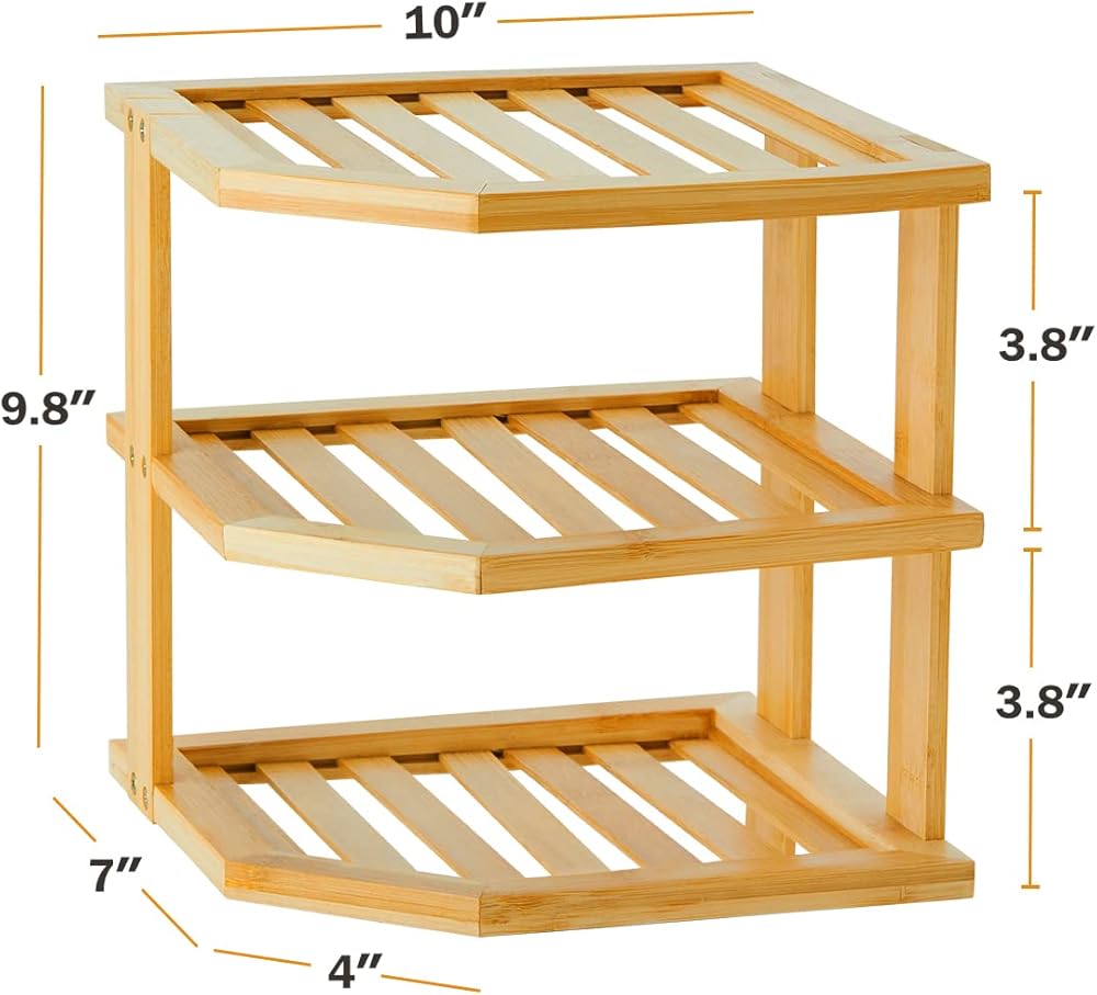 Small Standing Cornrner Shelves - The Bamboo kitchen organizer has a suitable size for your Kithcen. With the perfect size of 9.84X9.84X9.84 inches, this bamboo shelf will be a small delicate standing shelf in your kithen room. Besides the height between two shelves measures 3.8 inches,which assure you can place more plates or coffe cups.