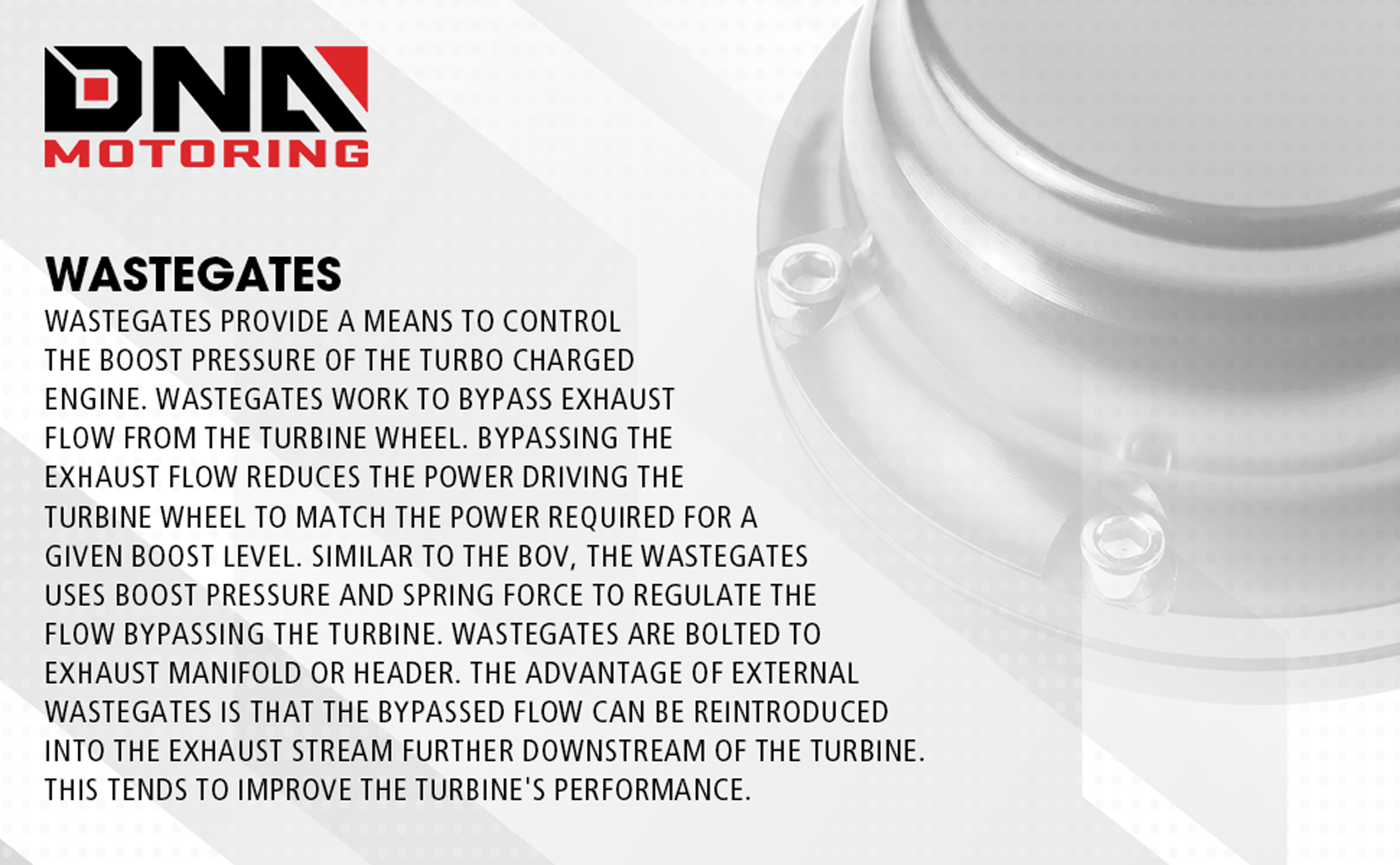 Wastegates provide a means to control the boost pressure of the turbo charged engine. Wastegates work to bypass exhaust flow from the turbine wheel. Bypassing the exhaust flow reduces the power driving the turbine wheel to match the power required for a given boost level. Similar to the BOV, the Wastegates uses boost pressure and spring force to regulate the flow bypassing the turbine. Wastegates are bolted to exhaust manifold or header. The advantage of external Wastegates is that the bypassed flow can be reintroduced into the exhaust stream further downstream of the turbine. This tends to improve the turbine's performance.