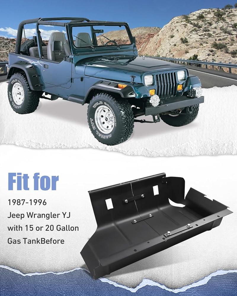 Applicable Model:This fuel tank skid is suitable for 87-95 Jeep Wrangler YJ, with a fuel tank capacity of 15 or 20 gallons.