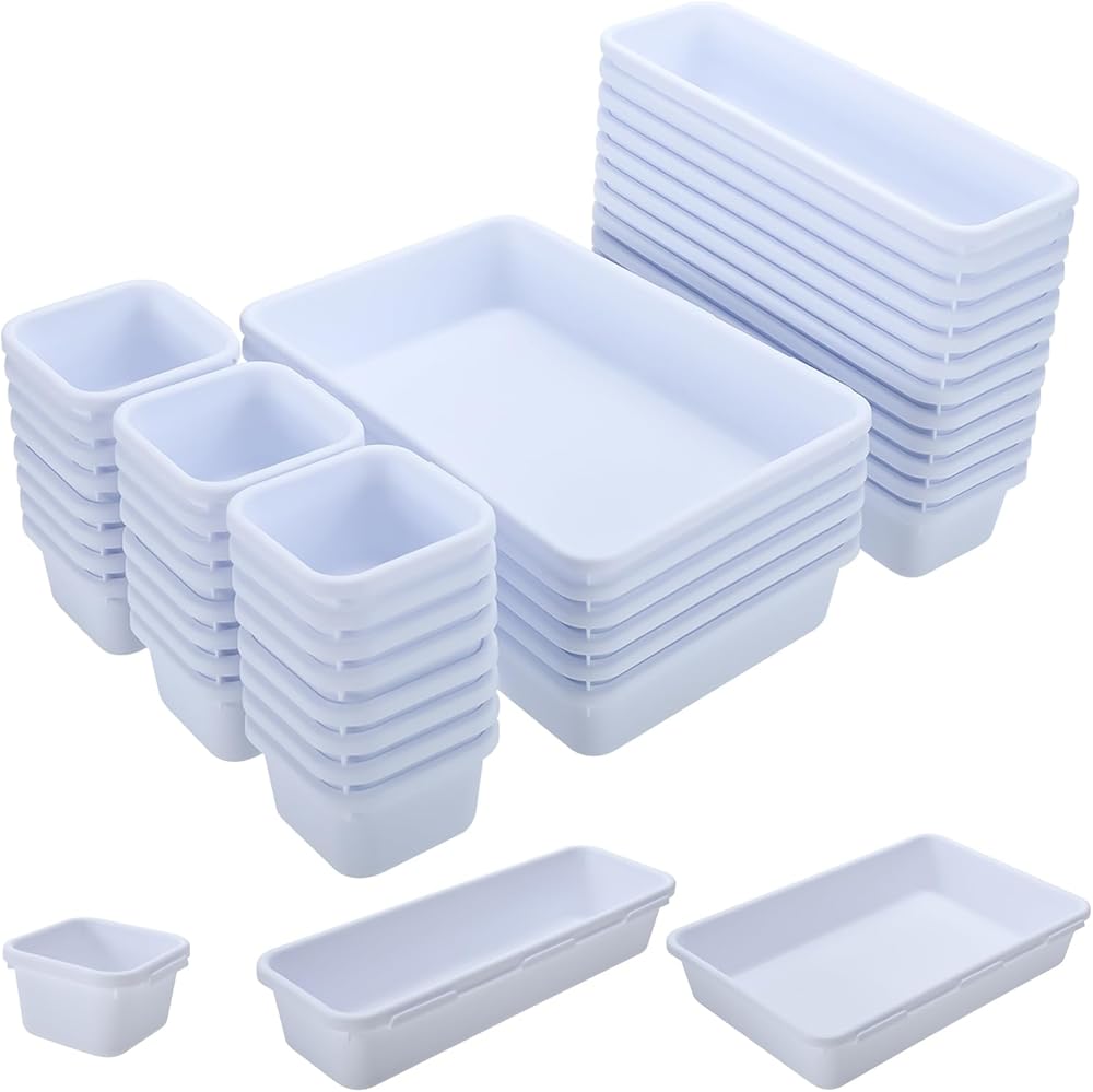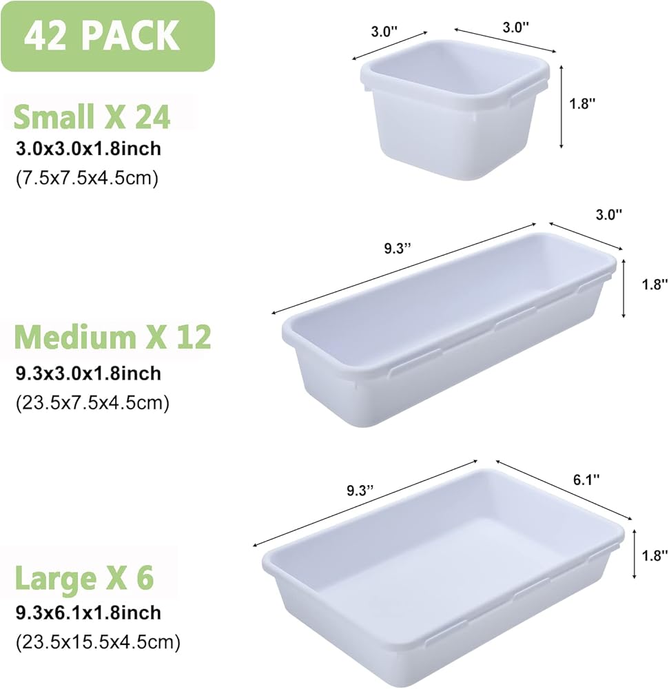جودة وحجم منظم السحب: مجموعة من 42 عبوة من منظم أدراج المكتب الضحلة تتضمن 6 صواني صناديق كبيرة كل منها 9.3 × 6.1 × 1.8 بوصة، 12 صندوق متوسط 9.3 × 3.0 × 1.8 بوصة، 24 صندوق صغير مقاس 3.0 × 3.0 × 1.8 بوصة. كمية كافية لاحتياجات الأدراج المختلفة، مقاس مناسب يناسب أي حجم درج أو احتياجات محددة.