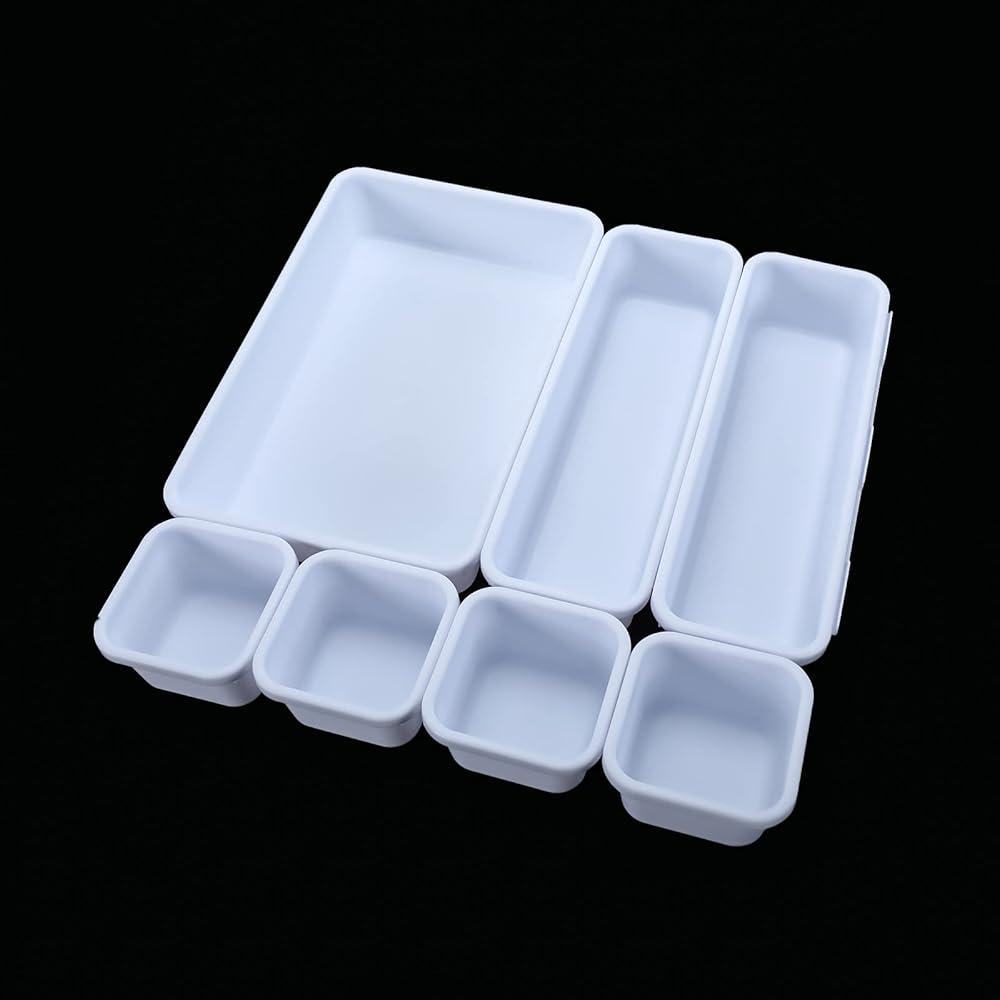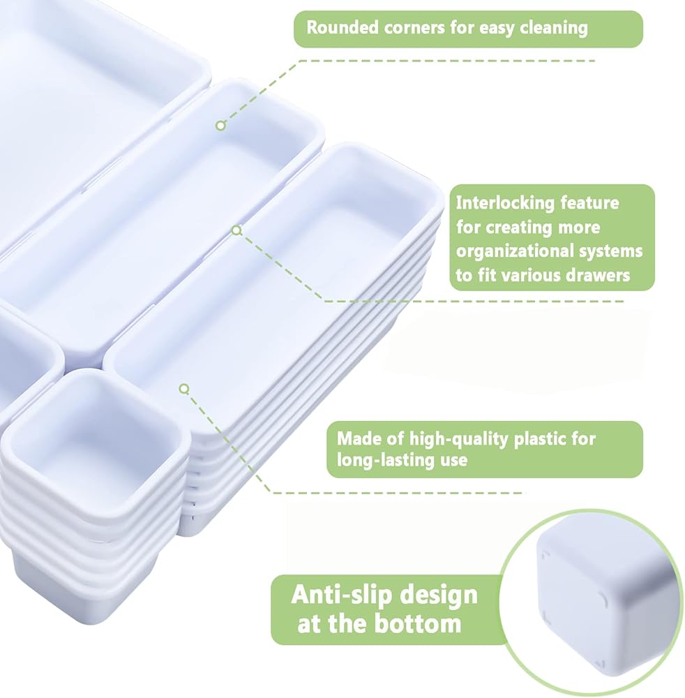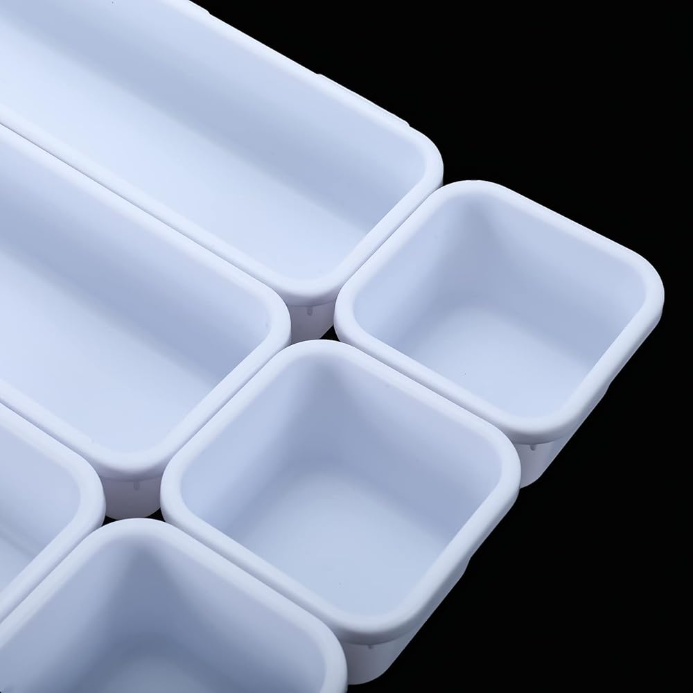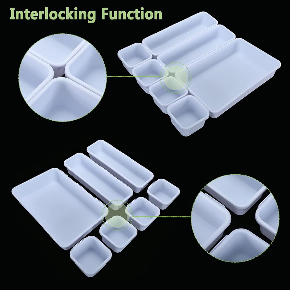 تصميم متشابك: يمكن استخدام منظمات الأدراج هذه معًا أو بشكل منفصل. يمكنك مزجها ومطابقتها بحرية لزيادة سعة التخزين في أدراجك لتناسب مجموعة متنوعة من احتياجات المنزل والمكتب، وتساعدك على مزج وإنشاء درج خاص بك، وهو حل جيد لأغراضك بشكل أنيق وأسهل في العثور عليها.