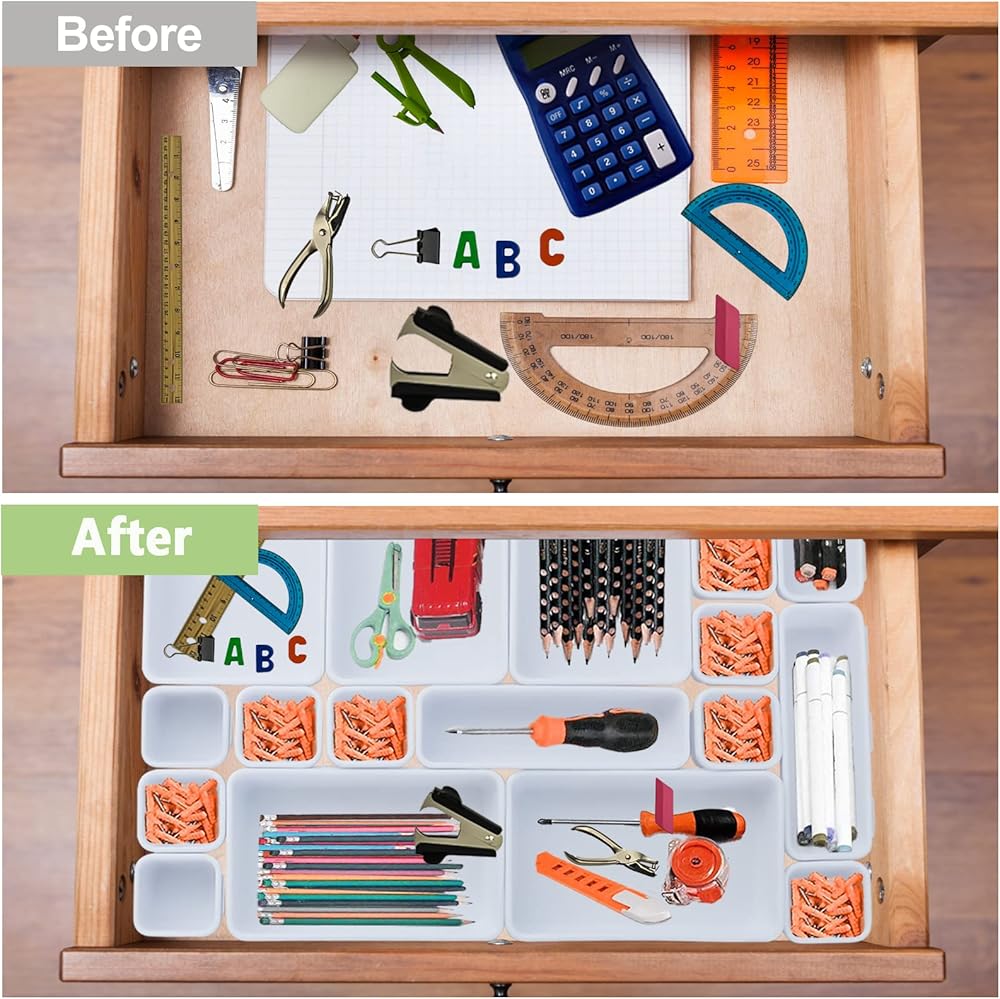 استخدام واسع: صناديق التنظيم مثالية لخزانة الملابس ودرج الحمام ودرج المطبخ والمكتب والجراج وما إلى ذلك. مثل تنظيم مستحضرات التجميل وأدوات المكياج وإكسسوارات الشعر وطلاء الأظافر والمجوهرات وفرش الشعر والفضيات واللوازم المكتبية والأدوات المختلفة وما إلى ذلك. صواني تنظيم أدراج المكتب متعددة الأغراض تحافظ على أغراضك منظمة.