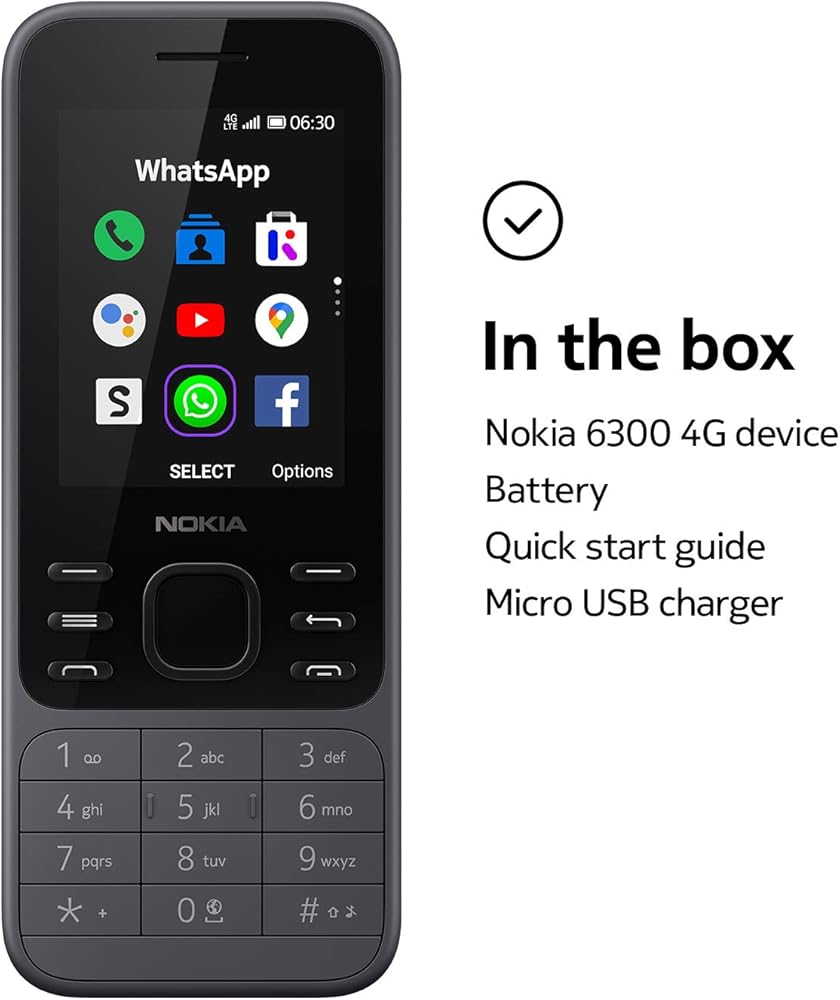 Say hello to Nokia 6300 4G – your conversation starter. Stay connected to everyone you love with WhatsApp and Facebook. Keep up with your top shows on YouTube and find your way with Google Maps – enjoy more streamlined experiences with speedy 4G. Plus, find answers, get information and reach out to friends with Google Assistant. All this powered to perform and packed into a durable polycarbonate shell so you can keep those chats going for longer. If your item is having issues connecting to your mobile network or your hotspot feature is not working as expected, please contact your carrier for assistance with network connections and hotspot activation. This device uses a nano SIM card. If you do not have a nano SIM card or your current SIM card does not fit this product, please contact your carrier for further assistance in getting a new SIM card. Compatibility: This device is designed to work with GSM carriers. This product will not support Verizon or Verizon subsidiaries. Please confirm compatibility with your chosen carrier before purchasing. For support with SIM card or network related issues, please contact your carrier for assistance in connecting your device to the chosen compatible network. Supported Network bands: 2G: 850 / 900 / 1800 /1900 3G: 850 / 900 / 1700(AWS) / 1900 / 2100 4G/LTE: 2, 3, 4, 5, 7, 12, 17, 28, 66, 71 Charging: This product is designed to be charged using the charging adapter and charging cable that are provided in the product box. Charging this device with any other charging adapter or cable may cause device malfunction. Please observe basic safety steps when charging this device and do not charge this product with malfunctioning or damaged equipment. Current Software Version: KaiOS Bluetooth Version/Range: 4.0 – 30' Range FAQ How do I connect my phone to my carrier network? If your Nokia phone and network are compatible, place your SIM card in the SIM card tray found in the battery compartment. Once your SIM card has been inserted into the device, power on your phone and proceed through the product setup steps. If you are not able to connect to your network after finalizing the product setup, please contact your carrier support for additional assistance as every carrier has different steps to assist you in ensuring your product connects to their compatible network. How can I ensure other people hear me on my microphone? If you are experiencing microphone issues with your device and your product has a Google Assistant button, please ensure that the Google Assistant button is not stuck or dirty as this will cause the microphone to not function as intended. If the Google Assistant button is not obstructed, please ensure that there is no dirt or debris in the headphone port of your product. How can I turn up the volume to my speaker? Please ensure that there is no dirt or debris in the headphone port of your product. Why is my phone feeling warm, closing apps or occasionally slowing down? During extended operation, the device may feel warm. In most cases, this is normal. To avoid getting too warm, the device may automatically slow down, close apps, switch off charging, and if necessary, switch itself off. If the device is not working properly, please visit Nokia's customer support website. They may recommend that you take your device to the nearest authorized service facility. My phone won't charge. What should I do? First ensure the issue isn't with the power source or socket you're using - you can quickly check this by plugging your phone into a different outlet, then checking if it charges. If the socket is not the issue, try taking a closer look at the power cable or charging port on your phone, ensuring everything appears as it should. Then, try turning your phone off completely and plugging it into the socket - bear in mind if the battery is completely drained, it might take up to 2 or 3 minutes to start charging. How can I contact support? Our customer support page offers a number of ways that you can contact support. Please visit the Nokia website for further assistance. How do I fix button issues on my phone? Before performing any additional troubleshooting steps, please ensure that your product does not show any physical damage, has not been exposed to water, the screen is clean, and your fingers and hands are not wet or dirty.