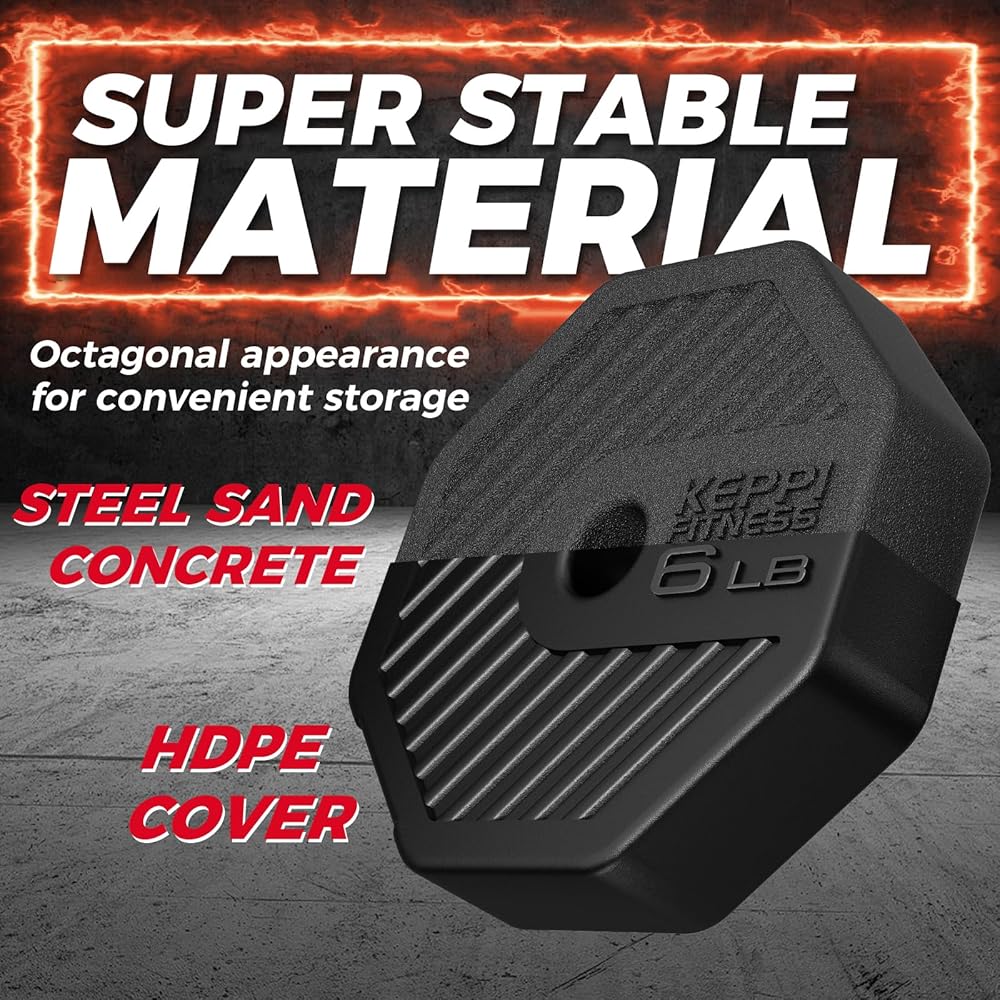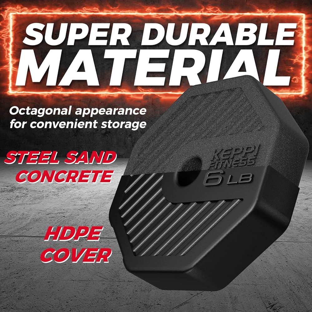 مادة متينة - تصميم على شكل مثمن، مضاد للدوران وسهل الحمل. غلاف لوحة الدمبل الصديق للبيئة مصنوع من مادة البولي إيثيلين عالية الجودة لمنع تلف الأرض والصدأ، وليس له رائحة. يتم تعبئة الجزء الداخلي بخليط من الأسمنت ورمل الحديد لضمان عدم التسرب.