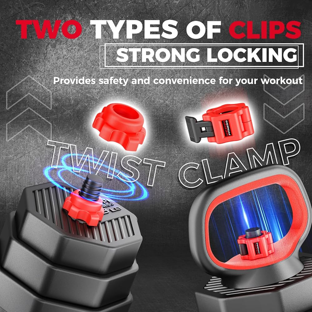 قفل أمان - تشتمل المجموعة على مشبك صامولة ومشبك سريع. يضمن ملاءمة محكمة مع قضيب الدمبل أو قضيب الحديد للحفاظ على ألواح وزن الدمبل في مكانها بشكل فعال. تصميم سداسي غير منتظم يجعل المشبك أسهل في الدوران. خيارات مختلفة، تحصل على نفس الصلابة والأمان.