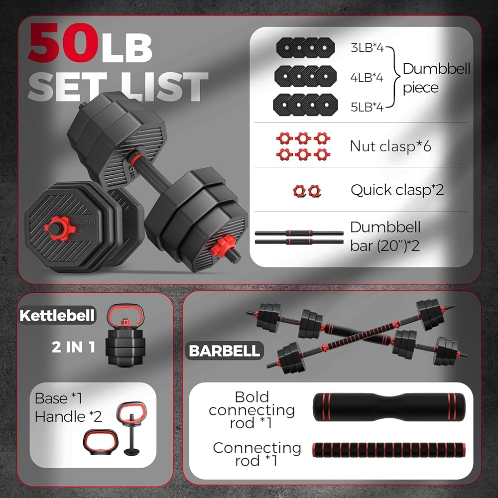 مجموعة دمبل متعددة الوظائف 4 في 1 - مع مجموعة دمبل كيبيفيتنيس، يمكنك الحصول على الدمبل وأجراس كيتل بيل وأثقال الحديد وحامل الدفع. يمكن دمج لوحات الوزن بحرية لتلبية احتياجات اللياقة البدنية المختلفة وكثافتها.