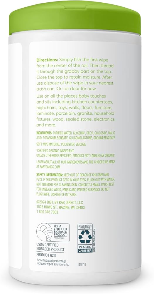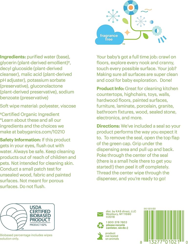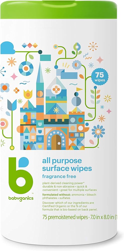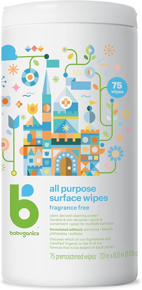 Babyganics مناديل سطحية لجميع الأغراض، 75 قيراط، نباتية وغير كاشطة، خالية من الأمونيا، بدون مبيضات، قد تختلف التعبئة
