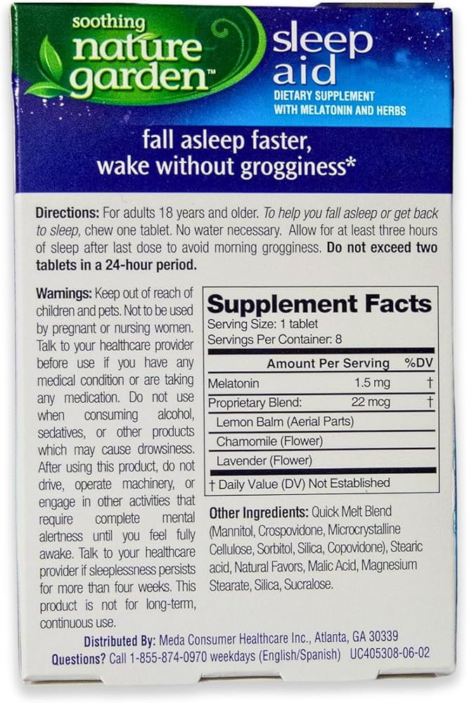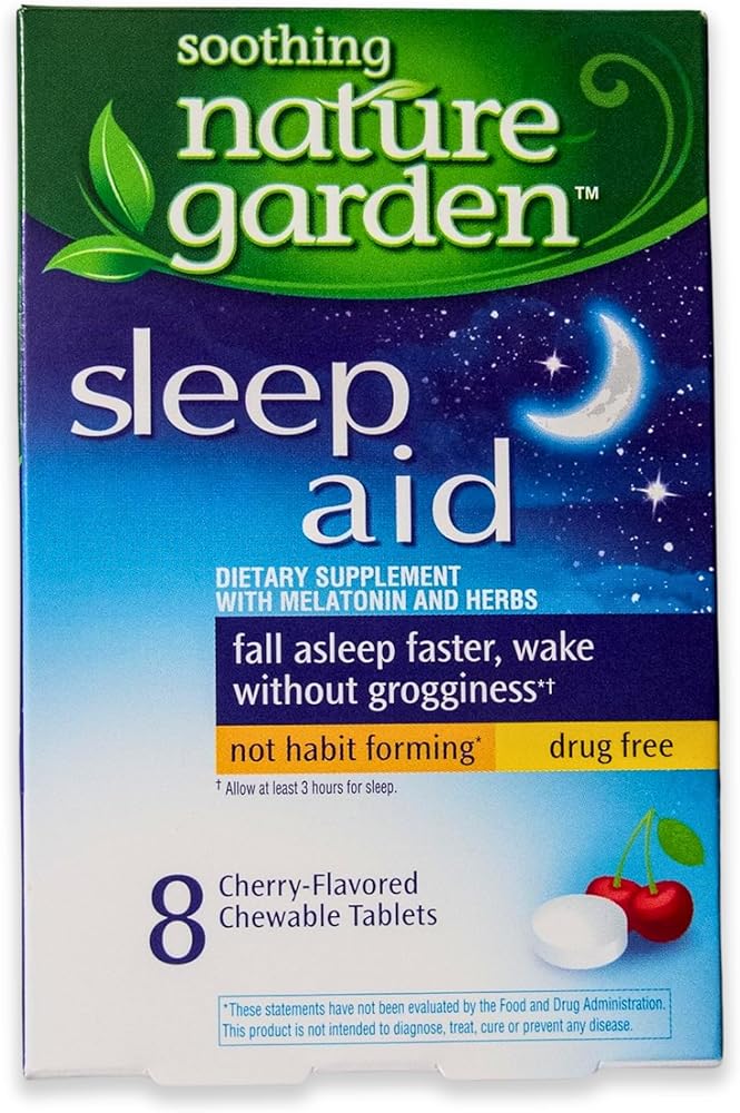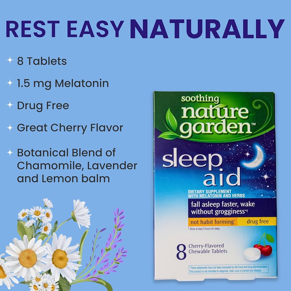 Fall asleep faster and wake without grogginess with Soothing Nature Garden Sleep Remedy. Drug free, not habit forming. Allow at least 3 hours for sleep. Contains 8 cherry flavored chewable tablets.