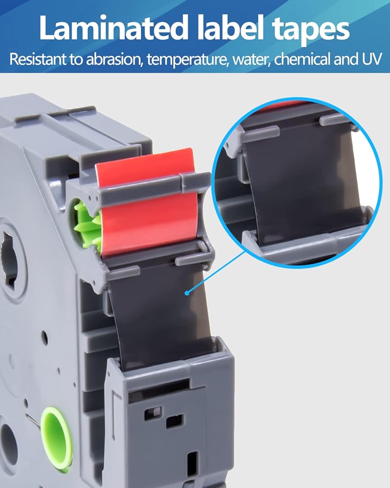 • هيكل متين: كل لفة من شريط Brother tz241 المتوافق مصنوعة من سطح مصفح، مما يوفر متانة إضافية ومقاومة للماء وأشعة الشمس والظروف القاسية