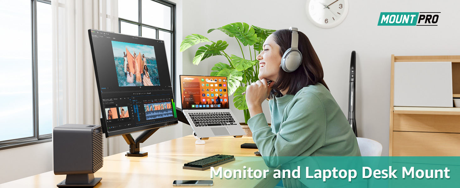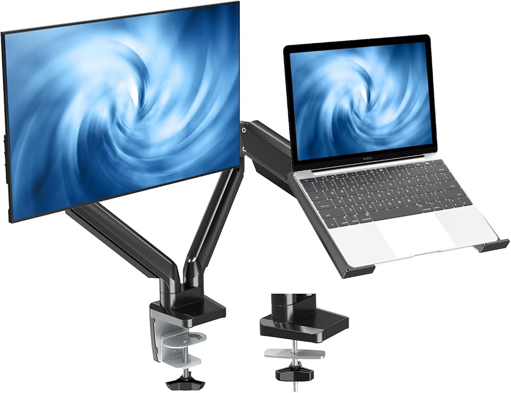 حامل شاشة MOUNT PRO وحامل كمبيوتر محمول يناسب الكمبيوتر المحمول مقاس 17 بوصة كحد أقصى وشاشة كمبيوتر مقاس 32 بوصة، وحامل كمبيوتر محمول وشاشة قابل للتعديل للمكتب، وحامل شاشة VESA مع صينية كمبيوتر محمول، كل ذراع يحمل ما يصل إلى 17.6 رطلًا