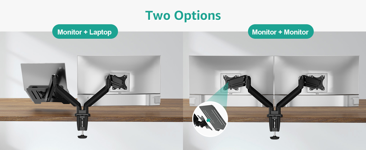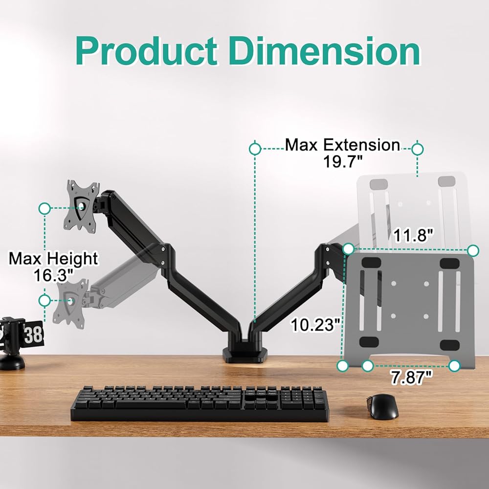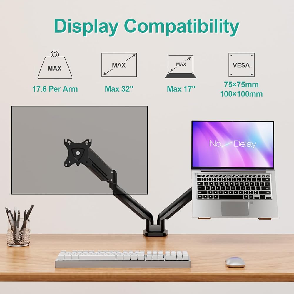 شاشة عالمية وحامل كمبيوتر محمول: يناسب حامل الشاشة هذا شاشات الكمبيوتر مقاس 13 بوصة إلى 32 بوصة، ويدعم الوزن الذي يصل إلى 3.3-17.6 رطل لكل ذراع، متوافق مع أنماط VESA 75 × 75 مم و100 × 100 مم. يبلغ طول صينية الكمبيوتر المحمول 11.8 بوصة وعرضها 10.23 بوصة، وتناسب الكمبيوتر المحمول مقاس 17 بوصة كحد أقصى. (يُرجى التأكد من أن حجم ووزن الشاشة والكمبيوتر المحمول الخاص بك ضمن معاييرنا قبل الشراء)