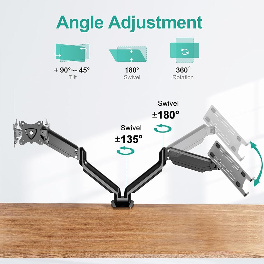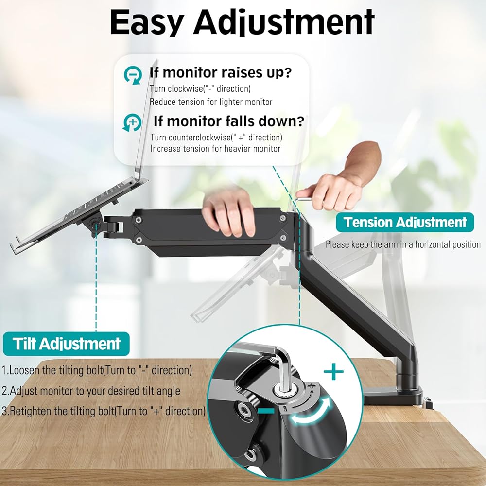 حامل شاشة كمبيوتر محمول وشاشة كاملة الحركة: حامل شاشة الكمبيوتر المحمول زنبركي الغاز قابل للتعديل في الارتفاع وزاوية دوارة لتلبية احتياجاتك. يوفر حامل الشاشة هذا إمالة من -45 درجة إلى +90 درجة، ودوران 180 درجة، ودوران 360 درجة، وارتفاع قابل للتعديل حتى 16.3 بوصة. مع حامل الكمبيوتر المحمول هذا، يمكنك بسهولة ضبط زاوية وارتفاع الشاشة بمرونة والعثور على الأفضل زاوية الرؤية، والتي تحرر إجهاد العين والرقبة والظهر.