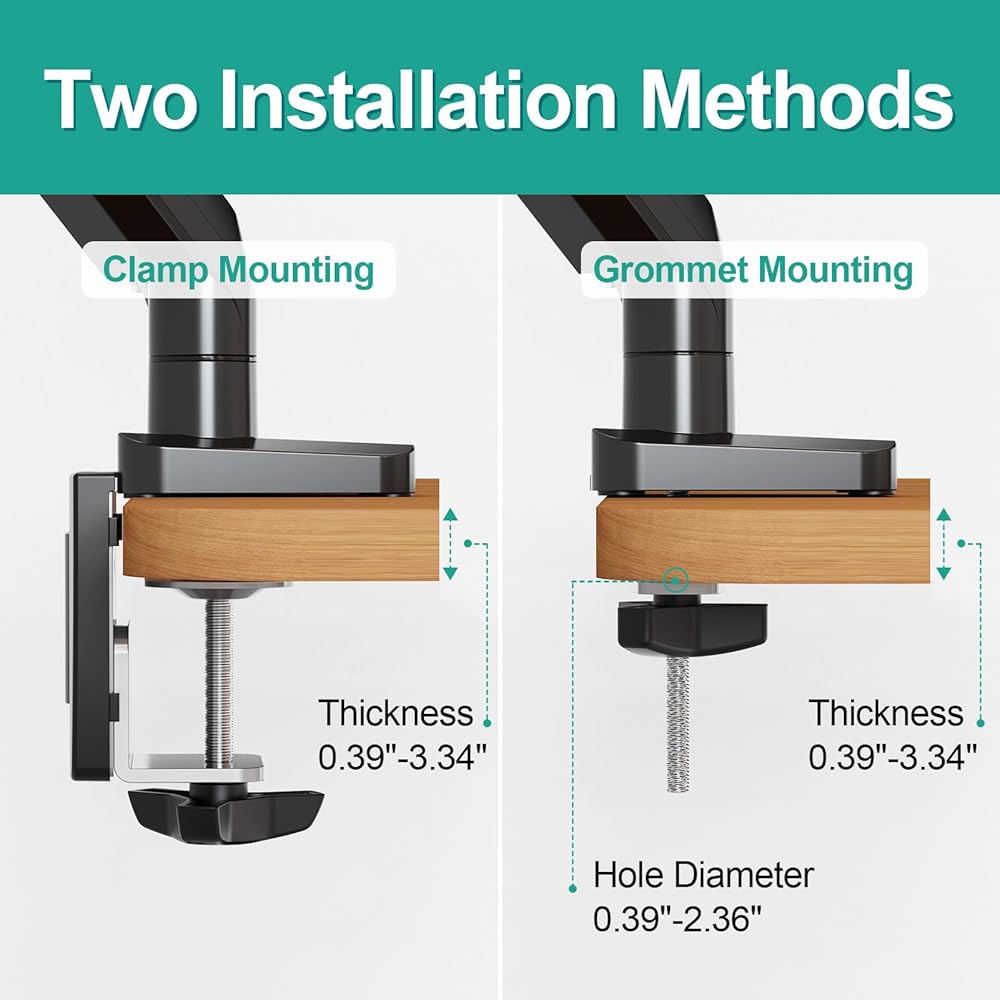 سهولة التركيب: يأتي حامل شاشة الكمبيوتر المحمول هذا مع الأجزاء الضرورية والتعليمات الواضحة. اعتمادًا على حالة مكتبك، يمكنك اختيار المشبك أو التثبيت بحلقة معدنية (مناسب للمكاتب التي يتراوح سمكها من 0.39 بوصة إلى 3.34 بوصة). يجب أن يتراوح قطر الثقب لقاعدة جروميت من 0.39 إلى 2.36 بوصة. لا تتردد في الاتصال بنا مع أي أسئلة.